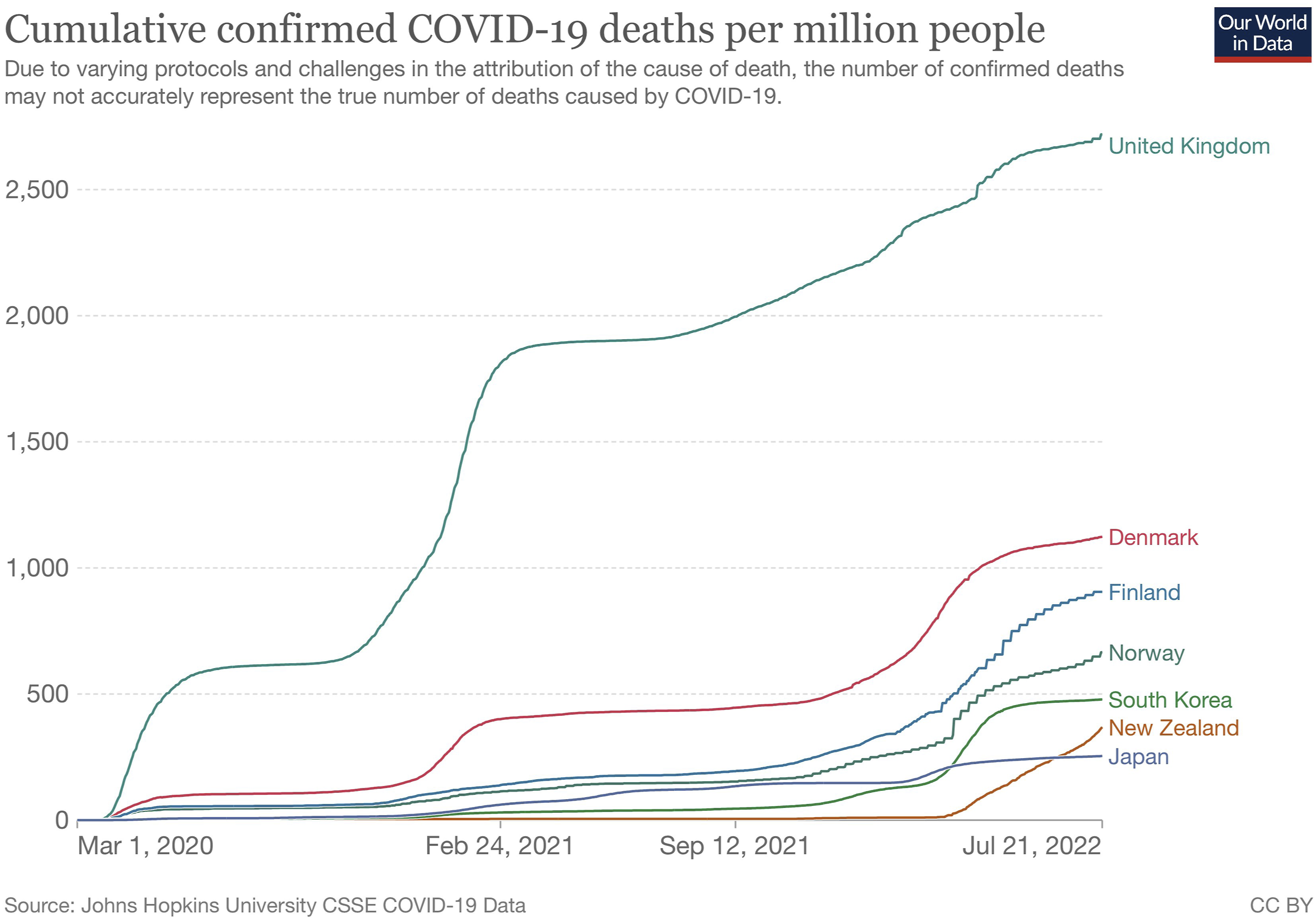 In summary, then, if we conjecture that this graph is being offered as a counterargument to the original post, we can find support for that conjecture by focusing on the right-hand side of the graph (nearest to the current time) and observing that the pattern of zero-COVID versus non-zero-COVID countries is reversed, compared to the original poster’s graph. However, if we interpret the graph as a whole, we find no evidence for any systematic difference between the two categories of country: New Zealand’s results are not out of line with the other countries depicted. This is very much as we might expect from a careful reading of the original graph, which documents a noticeable upswing in the death toll in New Zealand (and South Korea) in March 2022 compared to those countries’ previous results, but which provides no indication of the gap in death toll between New Zealand and the UK or Sweden having narrowed appreciably over the first 3 months of 2022.
