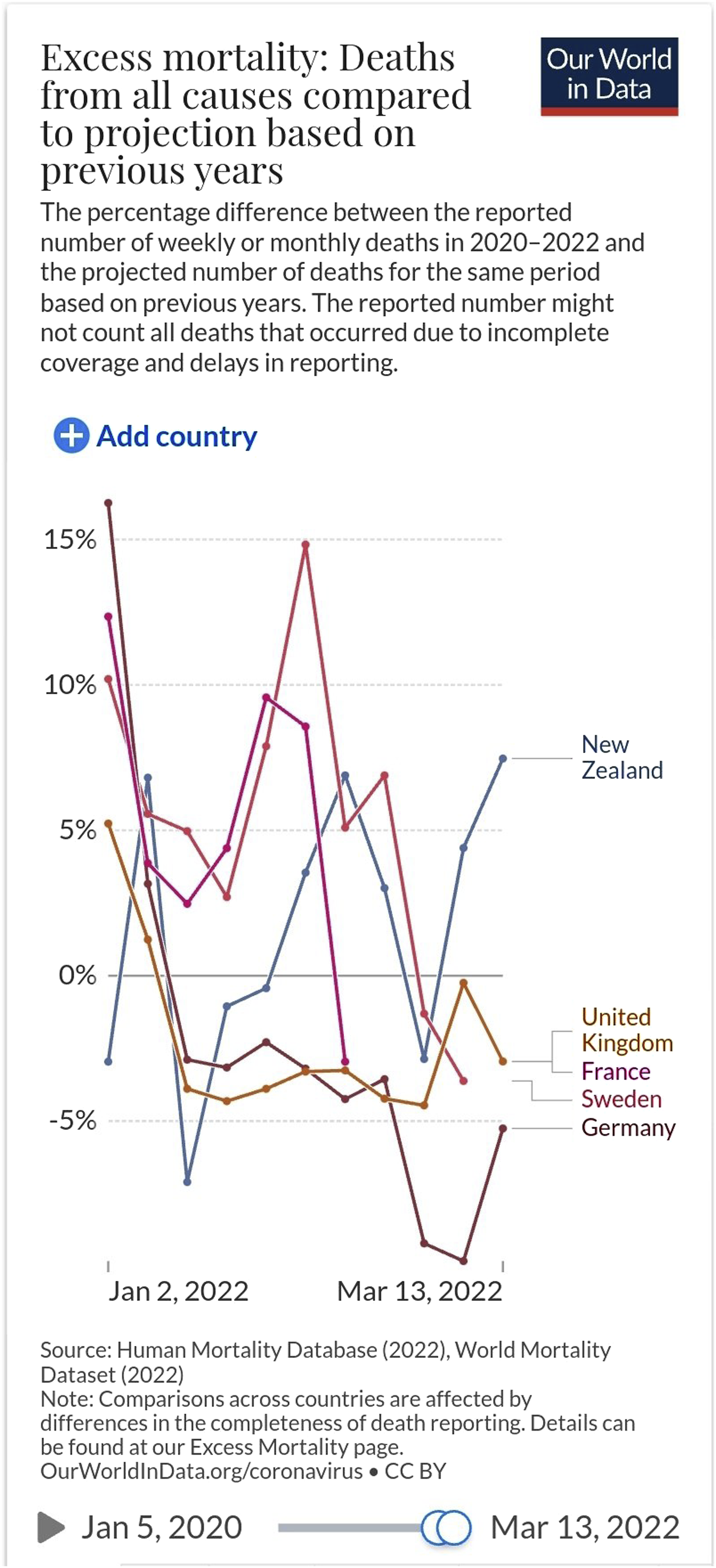 It is important to note that, while we can read Figure 6 as supportive of the argumentative agenda which we conjecture its poster has, the data presented do not ‘speak for themselves’, and objectively it is not clear that they constitute any kind of effective rebuttal to the argument in the original post. Not only does Figure 6 present a different outcome measure to Figure 5 (excess mortality rather than deaths directly attributed to COVID-19), more importantly it represents a week-by-week figure rather than an aggregate, and it does so over a different time range (from January 2022 rather than from February 2020) and with respect to a slightly different range of countries. Taking Figure 6 as a whole, the visual identification of clusters within it is less straightforward than for Figure 5 due to the comparatively disorganized visual layout (i.e. entangled lines). New Zealand’s status as an outlier emerges only at the last two time points represented in Figure 6: if we looked at mid-February, we would identify two clusters, one comprising New Zealand, the UK and Germany (better outcomes) and one comprising France and Sweden (worse outcomes). Indeed, if we average across the graph in order to get an impression of the aggregate outcomes across the time period depicted (i.e., the percentage excess mortality across this period), we would find Sweden to have the worst result of the countries represented, and New Zealand to have a middling result.
