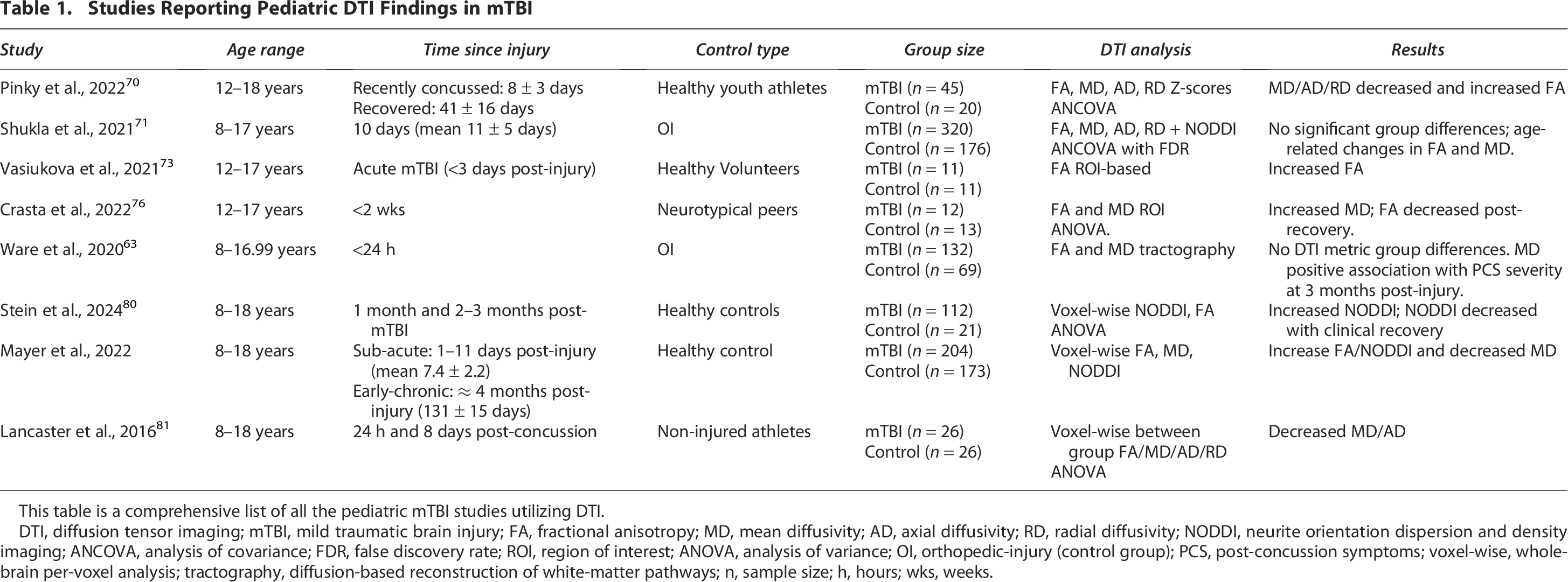 This table lists all the pediatric mTBI studies utilizing DKI.