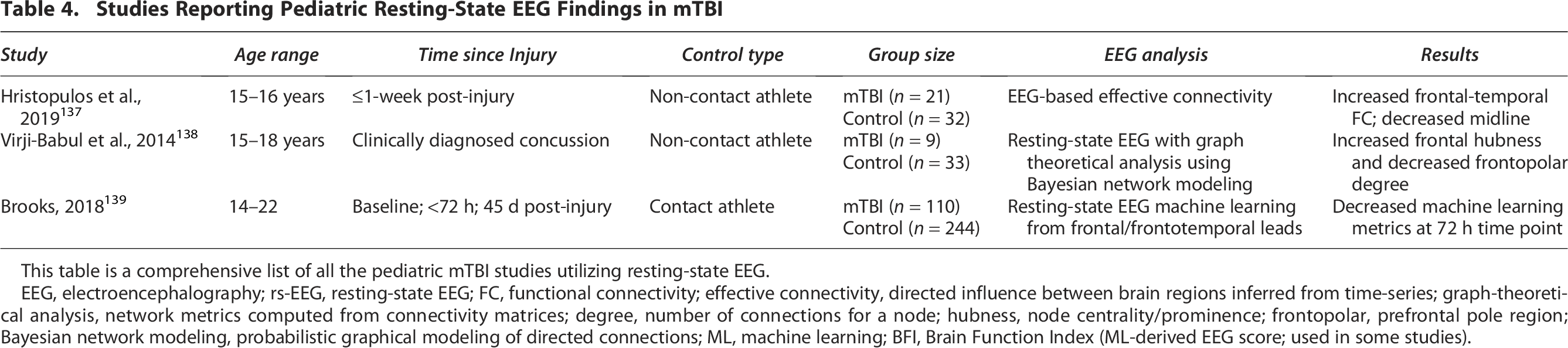 Pediatric EEG differs significantly from adult EEG patterns in typically developing individuals as well as across many different diseases.134–136 As such, pediatric subjects might exhibit a different set of electrophysiological markers that denote injury, recovery, or both. Understanding these differences is critical for age-specific interventions and therapeutic strategies. One study observed differences in brain connectivity between healthy adolescents and those recently concussed, suggesting a functional restructuring of resting state networks after concussion (<1 week). 137 Similarly, when analyzing adolescent athletes, combining resting-state EEG with graph theoretical approaches revealed marked alterations in local brain network properties following a concussion. 138 Connectivity measures can be a valuable tool to assess post-injury brain network changes and identify those at increased risk for subsequent injuries. 138 Moreover, a comprehensive study involving 354 male contact sport athletes showcased the EEG–BFI as a distinguishing tool for concussed athletes, especially within 72 h post-injury. Interestingly, BFI metrics reverted to control levels by day 45, reinforcing its value as a potential objective indicator for both concussion identification and recovery monitoring in both adults and pediatrics. 139 However, the BFI metric has limitations, as it does not appear to effectively distinguish between RHI and concussion groups. Some studies focused on basic attention-related EEG measures, finding differences between pre-season and post-season recordings as well as associated EEG changes with head impact exposure. 140 Conversely, subconcussive events-when recurrent-may induce nuanced, incremental EEG shifts. 140 A concise synthesis of pediatric concussion EEG studies can be found in Table 4.