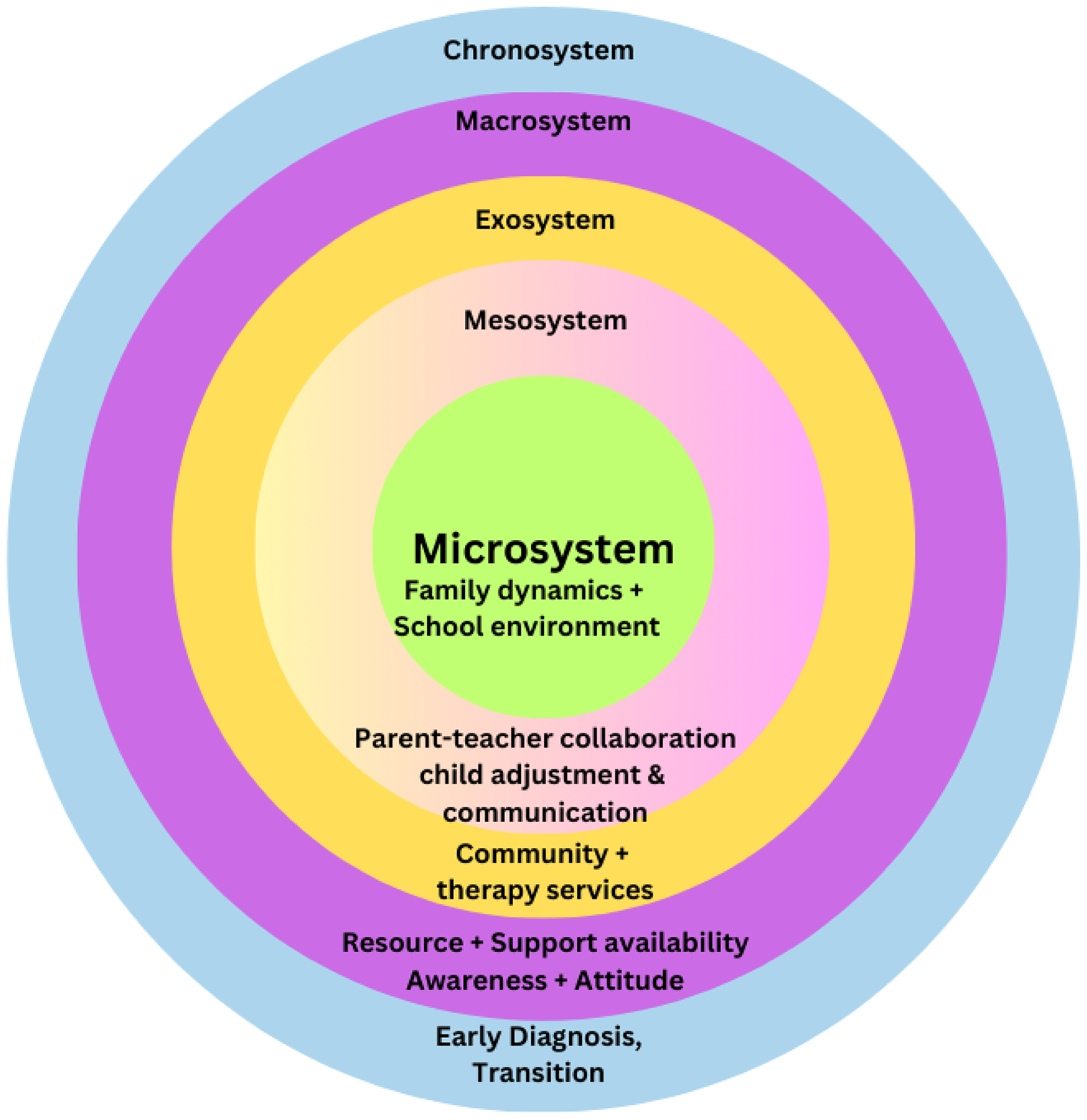 A systems model illustrating the interconnected layer of influence on a dyspraxic individual. note: Microsystem (immediate environment: family dynamics and school environment); mesosystem (parent-teacher interaction ,child adjustment, and communication); exosystem (external settings that indirectly affect the individual, such as community and occupational therapy access); macrosystem (cultural values, beliefs, resources, support availability, awareness, and attitudes); chronosystem(time and historical context; early diagnosis and transitions between educational and occupational systems). Source: Each layer impacts the Dyspraxic person's experience, adapted from Bronfenbrenner's (1986) ecological systems model. Alt-text: An infographic showing five concentric circles, illustrating ecological systems theory. The outermost circle, colored maroon, represents the Chronosystem, focusing on early diagnosis and transition. Inside that, the magenta circle is the Macrosystem, covering resource support, availability, awareness, and attitude. The yellow circle, third from the center, is the Exosystem, detailing community and therapy services. Next, the light pink circle is the Mesosystem, highlighting parent-teacher collaboration, child adjustment, and communication. At the very center, the lime green circle signifies the Microsystem, representing family dynamics and the school environment.