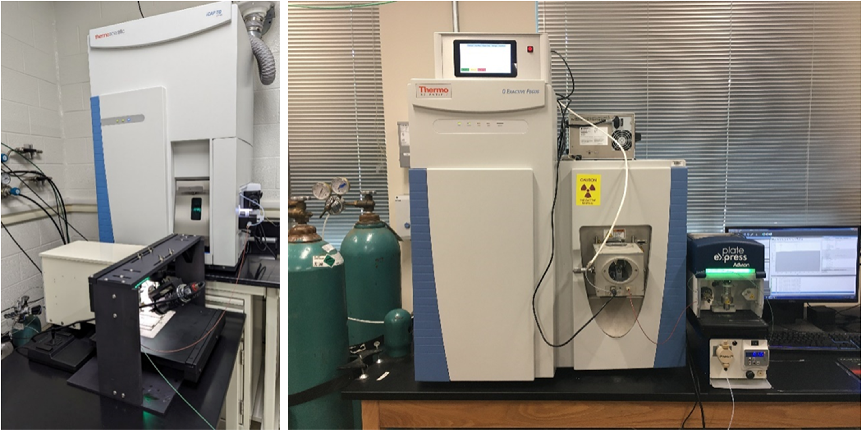 The microextraction ICP-MS instrument platform (left) and the microextraction LS-APGD-Orbitrap-MS instrument platform (right).