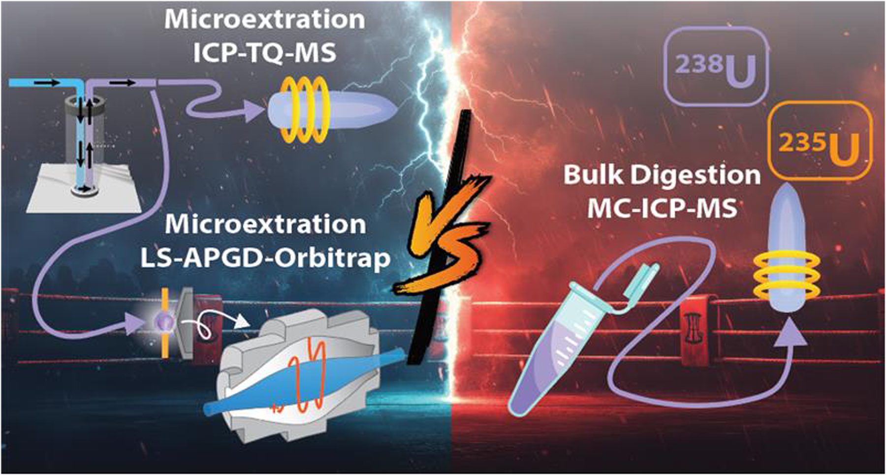 Additional studies demonstrated the success of coupling microextraction sampling with a quadrupole-based ICP-MS for the analysis of solution deposited uranium/plutonium10,11 and even solid particulates.12,13 The direct sampling technique allows for the determination of multiple distributions of uranium particulates collected on the same swipe without interference from the swipe matrix. The small sample size (∼8 mm2) allows for potential mapping of the swipe surface. Additionally, detection limits for the microextraction-ICP-MS method were determined to be ∼50 pg of 238U and demonstrated accurate and precise isotope ratio measurements for uranium reference materials. Related, extraction efficiency (of the microextraction process) has been demonstrated for uranium particulates to be between 94–99% for uranyl fluorides and nitrates, respectively. 12 Subsequent efforts have looked to expand the range of applications of the microextraction method to biological materials14,15 and even nanoparticles 16 on an ICP-MS platform.