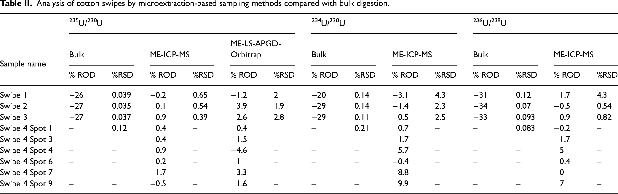 The fourth swipe sample was prepared to provide insight into the ability of microextraction-based sampling approaches to accurately determine the various signatures that could be separately present on a swipe surface (as opposed to homogenizing the results in a bulk format). For the microextraction LS-APGD-Orbitrap method, the various sample loadings were determined (for the 235U/238U) within 5% RD for their respective standard; for microextraction ICP-MS, the various sample loadings were determined within 2% RD. The microextraction ICP-MS method also determined the minors within 10% RD.