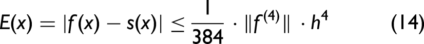 One method of finding a polynomial function that passes through the calibration points is the Lagrange method. However, the polynomial found using that method is prone to oscillations between points resulting in large interpolation errors. A better method to use which avoids these oscillations is the cubic spline interpolation, 7 a piecewise polynomial interpolation method where the calibration points are the nodes with a cubic polynomial interpolation function between them. The cubic polynomials are subject to the conditions that the functions are continuous and the first and second derivatives are continuous at the nodes. These conditions, together with additional constraints imposed by the choice of boundary conditions, result in a set of equations represented in matrix form. This matrix equation is then solved to determine the cubic spline polynomial coefficients.