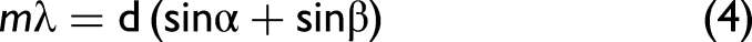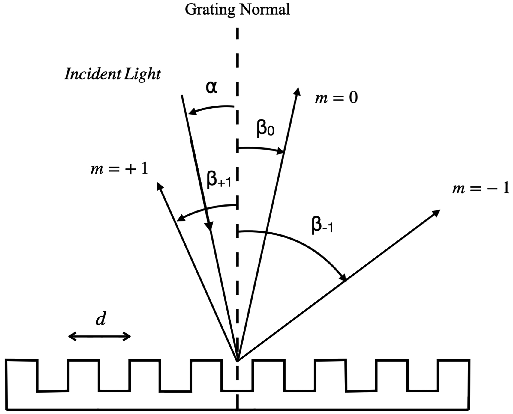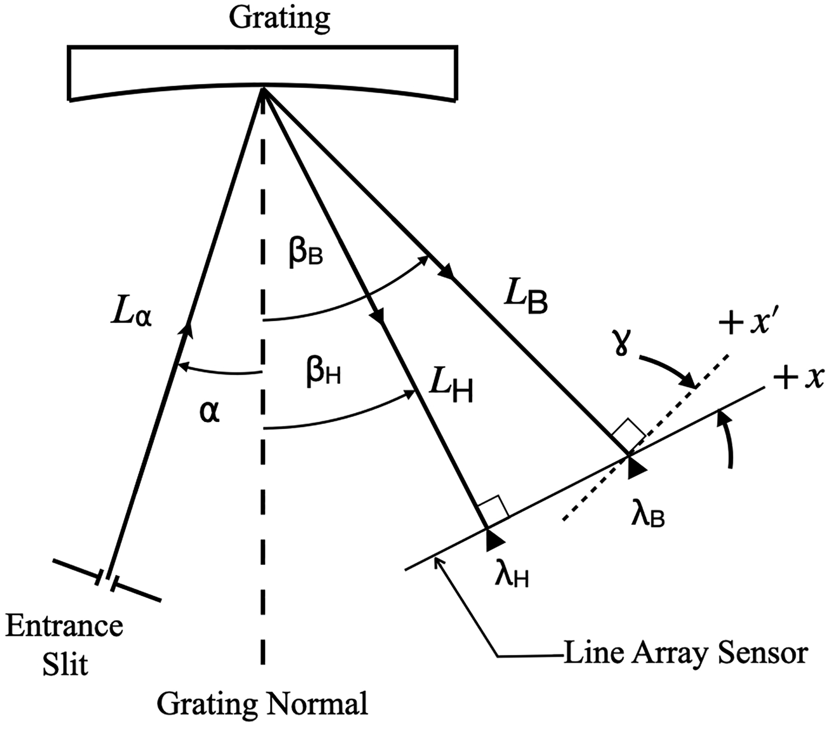To derive the linear wavelength dispersion along the axis of the pixels, consider a diffraction grating with incident and diffracted light rays shown in Figure 2. For this arrangement, the grating equation is