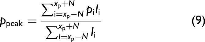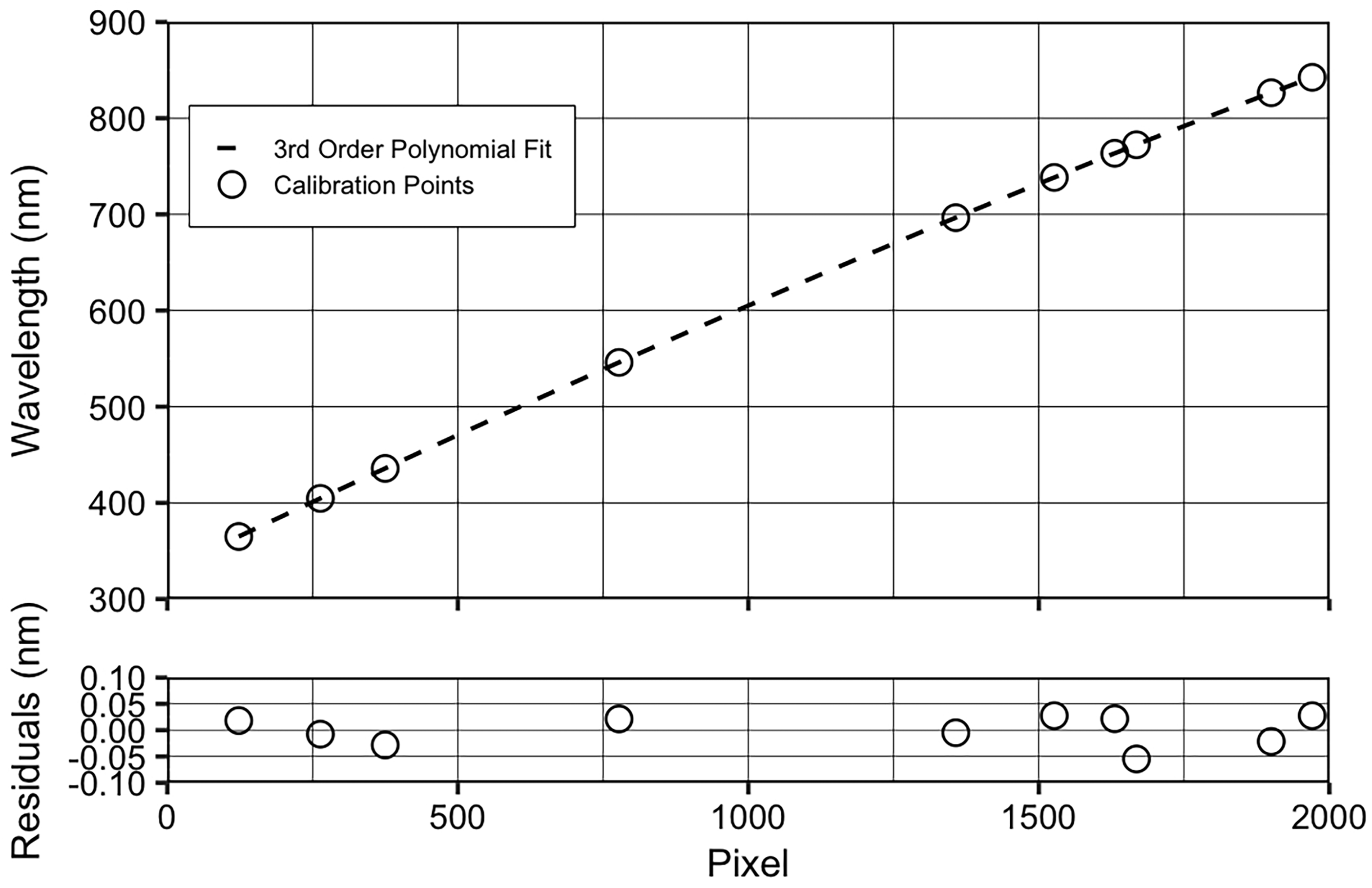 Calibration spectral data was obtained from a mercury–argon (Hg–Ar) spectral calibration lamp. This lamp has many spectral lines in the ultraviolet (UV), visible (Vis), and near-infrared (NIR) wavelength regions suitable for use in wavelength calibration. A total of 10 isolated peaks were selected for use in calibration. The pixel positions of the spectral lines were located to subpixel precision using the centroid method4,9 shown in Eq. 9. The peak pixel location is calculated as a weighted average of the pixels (with light intensity as the weighting distribution) within a window