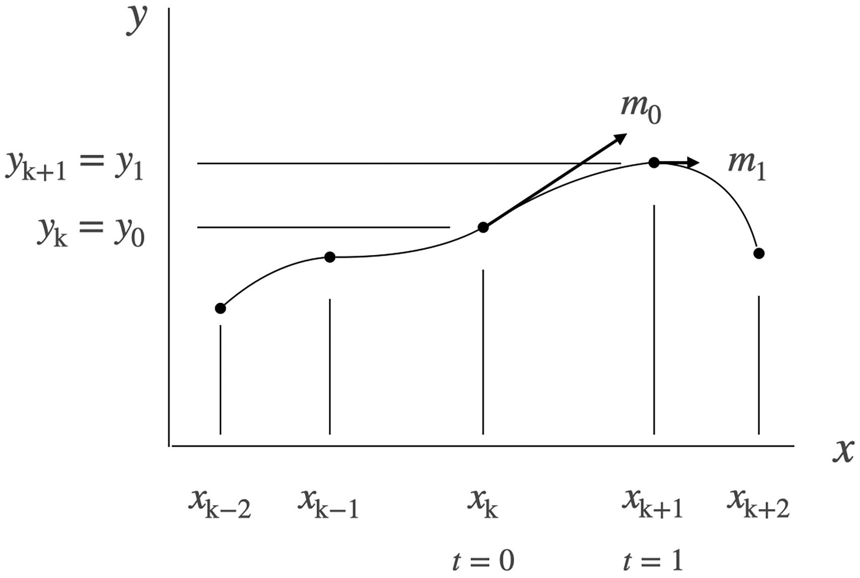 Another way to approximate the slope at a node is to calculate the slope of the line that connects the previous node to the next node. This is a central difference method similar to the Catmull–Rom spline (CRS)