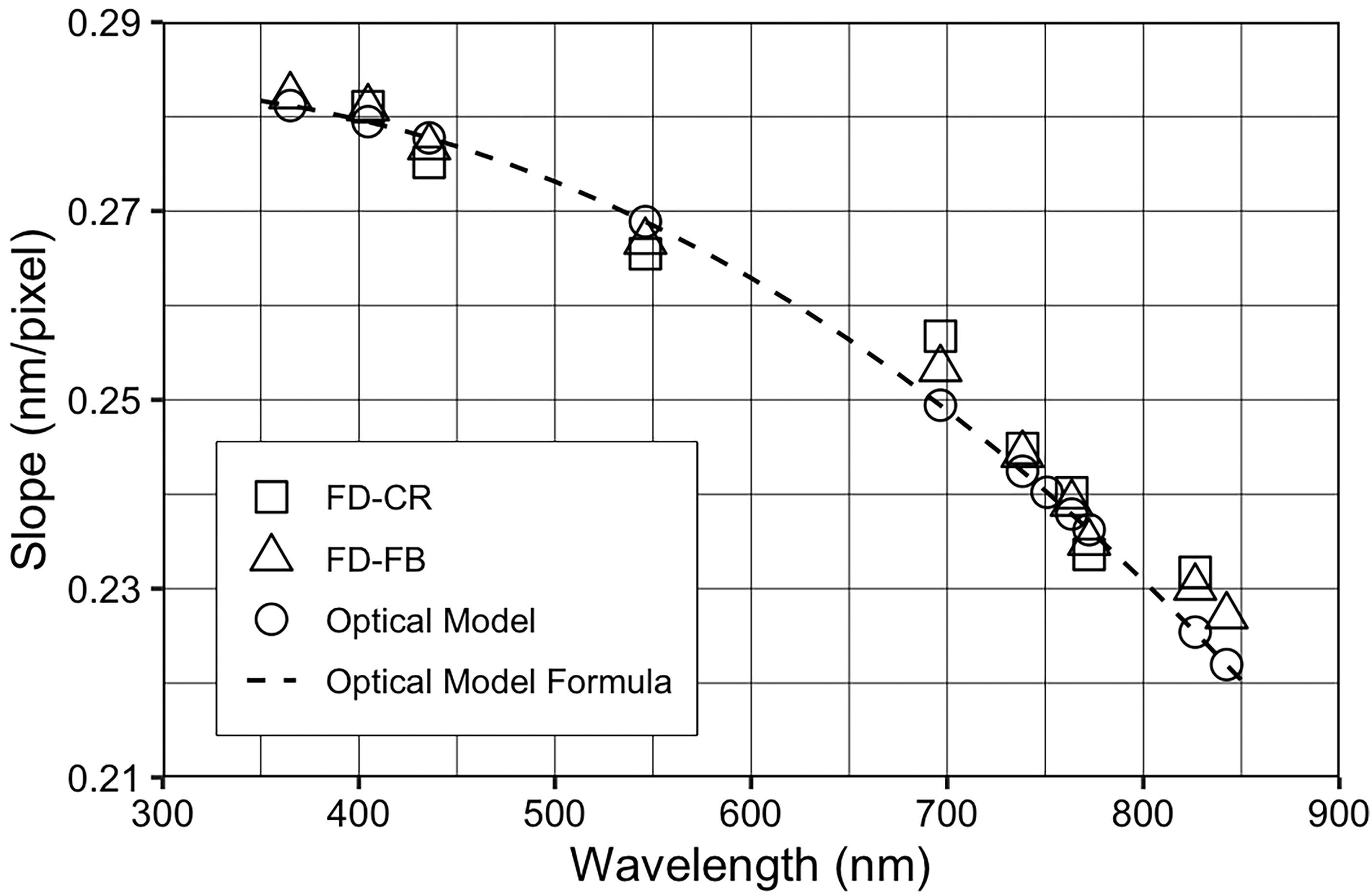 The optical system parameters are then optimized so that the modeled dispersion matches the calibration data, as was done by Liu and Hennelly 1 and others cited in their study. In that example, the full optical model used six parameters related to the grating, and the spectrometer and camera geometry. However, for faster calculations, only three optical parameters were varied in a least-squares fitting procedure to determine those three parameters. The rest of the parameters were fixed. Mathematically, this is equivalent to a polynomial fit to the calibration data, except that the model parameters correspond to the physical parameters of the spectroscopic system.