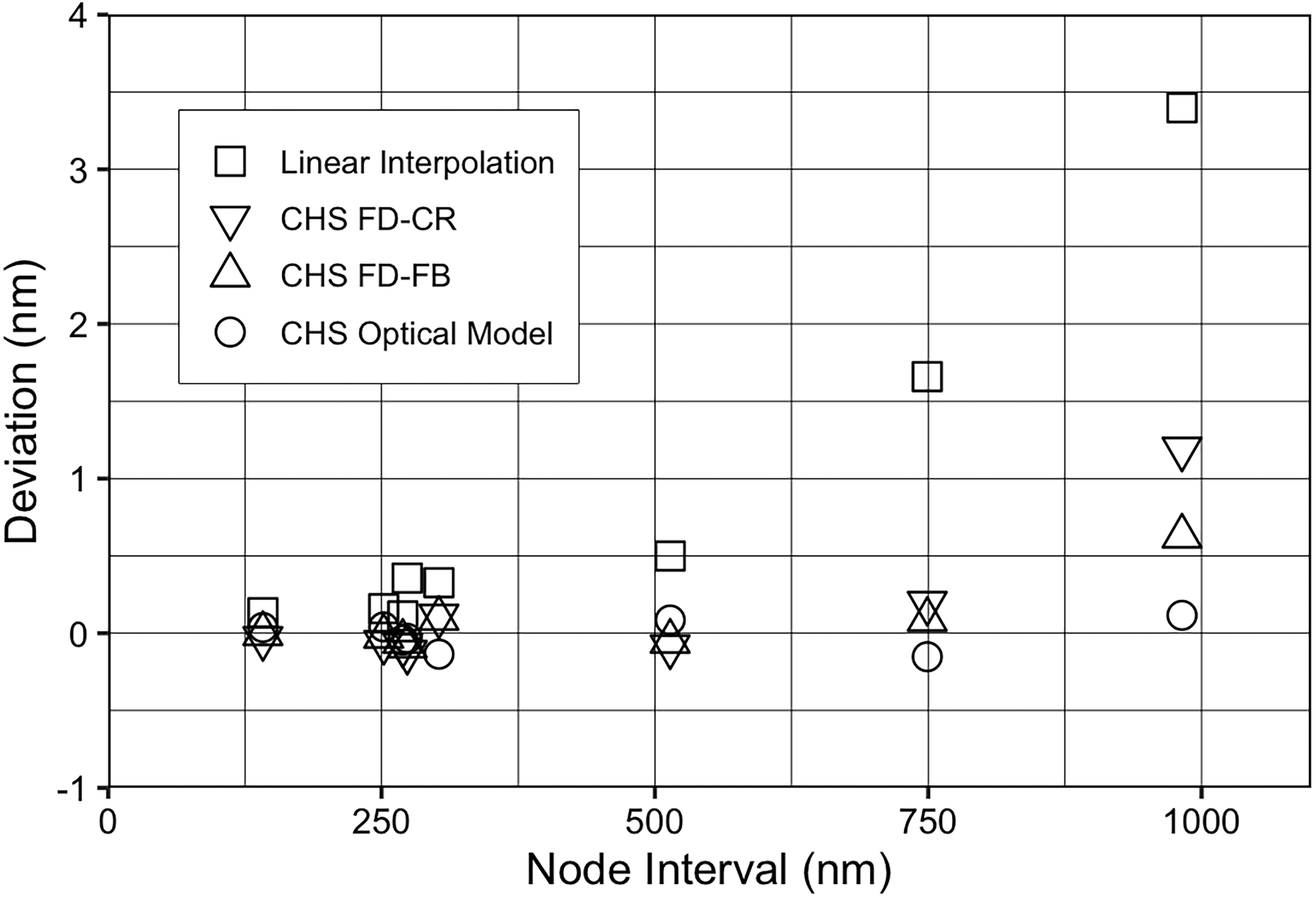 The deviations between the predicted (interpolated) wavelengths and the known wavelengths were calculated using these different slope calculation methods. Figure 6 shows a plot of the deviations versus the interpolation interval between nodes. The deviation from a calibration using linear interpolation is also included for comparison. The CHS method has the smallest interpolation deviations. As expected, when the slopes are approximated, the interpolation deviations increase as the interval between the nodes increases. At larger intervals, the deviation is smaller for the forward-backward method compared with the CRS or central difference method, indicating a better approximation of the slopes. This underscores the importance of accurately determining the slope. Interestingly, for CHS using slopes derived from the optical model, the deviation does not increase as the interpolation interval increases (at least with the calibration data studied here). This suggests that the interpolation remains accurate even with wider node spacing.