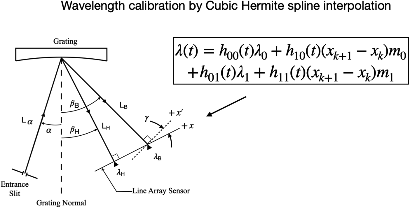 An important feature of this calibration procedure is that the interpolating functions are completely determined by the calibration points themselves and the slopes (wavelength linear dispersion) which are derived from the grating equation and spectrometer geometry. The calculation method is explicit, work-flow efficient and unlike polynomial regression or model parameter fitting, there is no need for an intermediate computation to arrive at the calibration function.