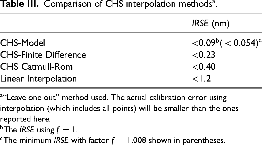 The polynomial fitting method used to determine the calibration curve is more mathematically complex due to matrix operations in the regression algorithm. In practice, polynomial fitting routines are readily available in most software numerical packages and are easy to use. However, the computation still needs to be performed offline. In contrast, the CHS is a simplified method in that the calibration wavelengths and the known slopes (linear dispersion) at those wavelengths are enough to determine the calibration interpolating functions. The slopes are calculated from a formula with known optical system parameters. The instrumental factor which improves the interpolation error is calculated once.
