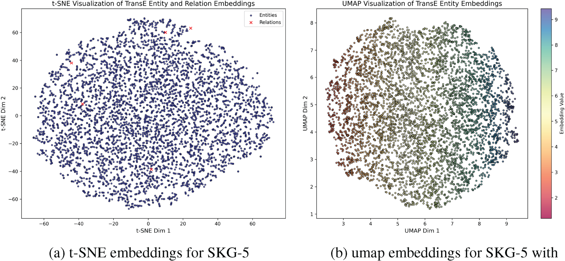 TransE t-SNE and UMAP visualizations are showcased in Figure 7(a) and (b). Notably the nature of the clustering is quite different. Of course, both t-SNE and UMAP are not appropriate for strictly defining cluster membership, they can give an understanding of what clusters might exist. In this case, we might inspect that the centrality metrics for SKG-237 are misleading. Future work should include different investigations to the centrality metric beyond the average, per se.