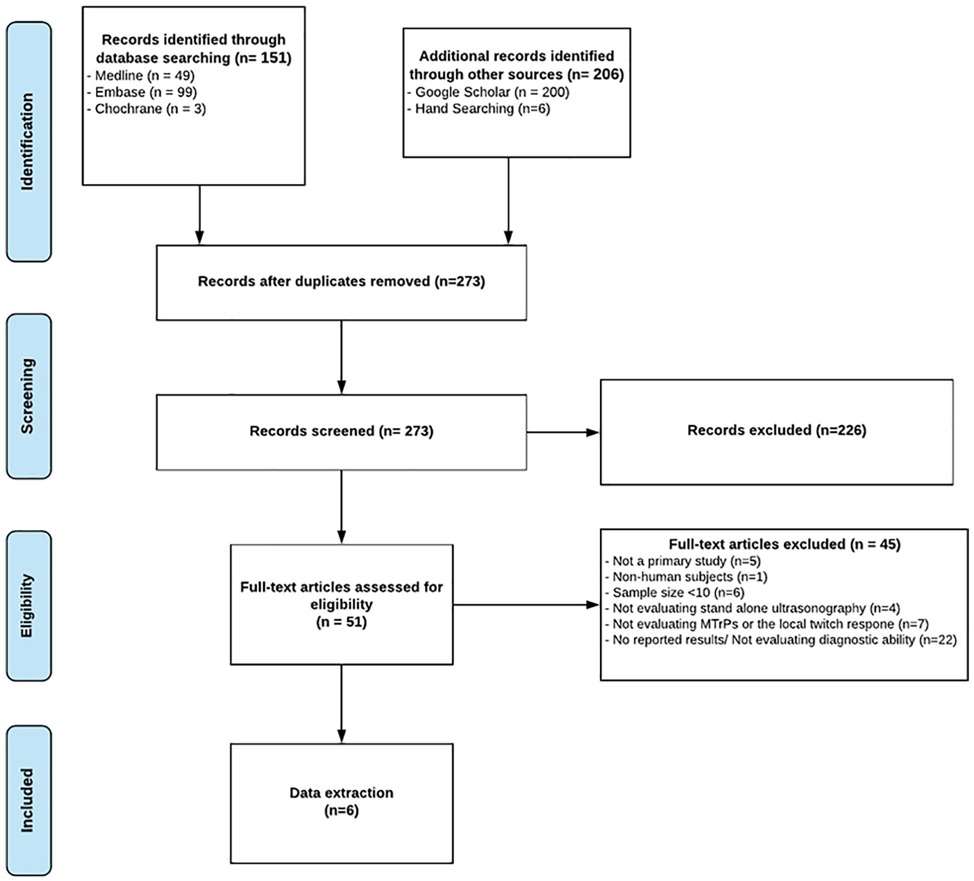 Data sources had to: (1) be a primary study published fully in a peer-reviewed journal; (2) be investigating patients suspected of having myofascial pain syndrome in any muscle; (3) be aimed to diagnose MTrPs or the local twitch response; (4) have used stand-alone ultrasonography as the index test; (5) have used “Palpation” as a reference test for detecting MTrPs or “Visual Inspection” as a reference test for the local twitch response; and (6) have calculable or reported diagnostic metrics (e.g., diagnostic percentages, concordance, accuracy, sensitivity, specificity, or positive/negative predictive values). Studies published before 1980 were excluded, as study methodologies and technological development were limited before that time (i.e., color Doppler development occurred in 1985). 53 Studies were also excluded with sample sizes of <10 patients as well as case reports and conference proceedings, as diagnostic accuracy measurements from such studies are of limited generalizability. Finally, studies were excluded that measured the diagnostic or therapeutic capabilities of a combination of ultrasonography and other tools (i.e., vibration elastography) as they can improve or lower the diagnostic ability of ultrasonography as a stand-alone modality.