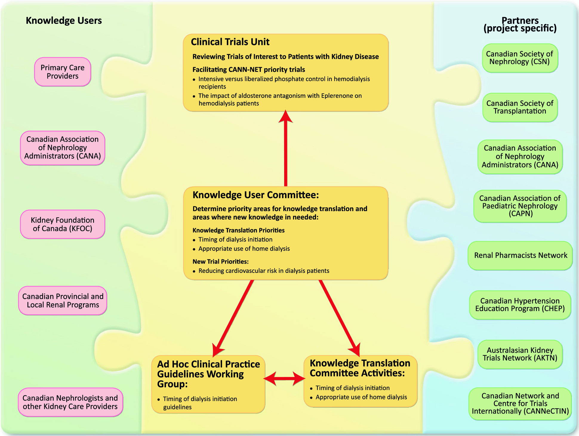 In Canada, the care of patients with kidney failure is generally organized and funded through geographically based kidney care programs with dyad medical and administrative lead structures. These decision makers are unique since they typically hold multiple roles within kidney care programs, serving as administrators, clinicians, researchers and policy makers. CANN-NET has established a committee of these knowledge users, with the primary goal being to inform CANN-NET priorities for new clinical trials and to prioritize and facilitate knowledge translation activity.
