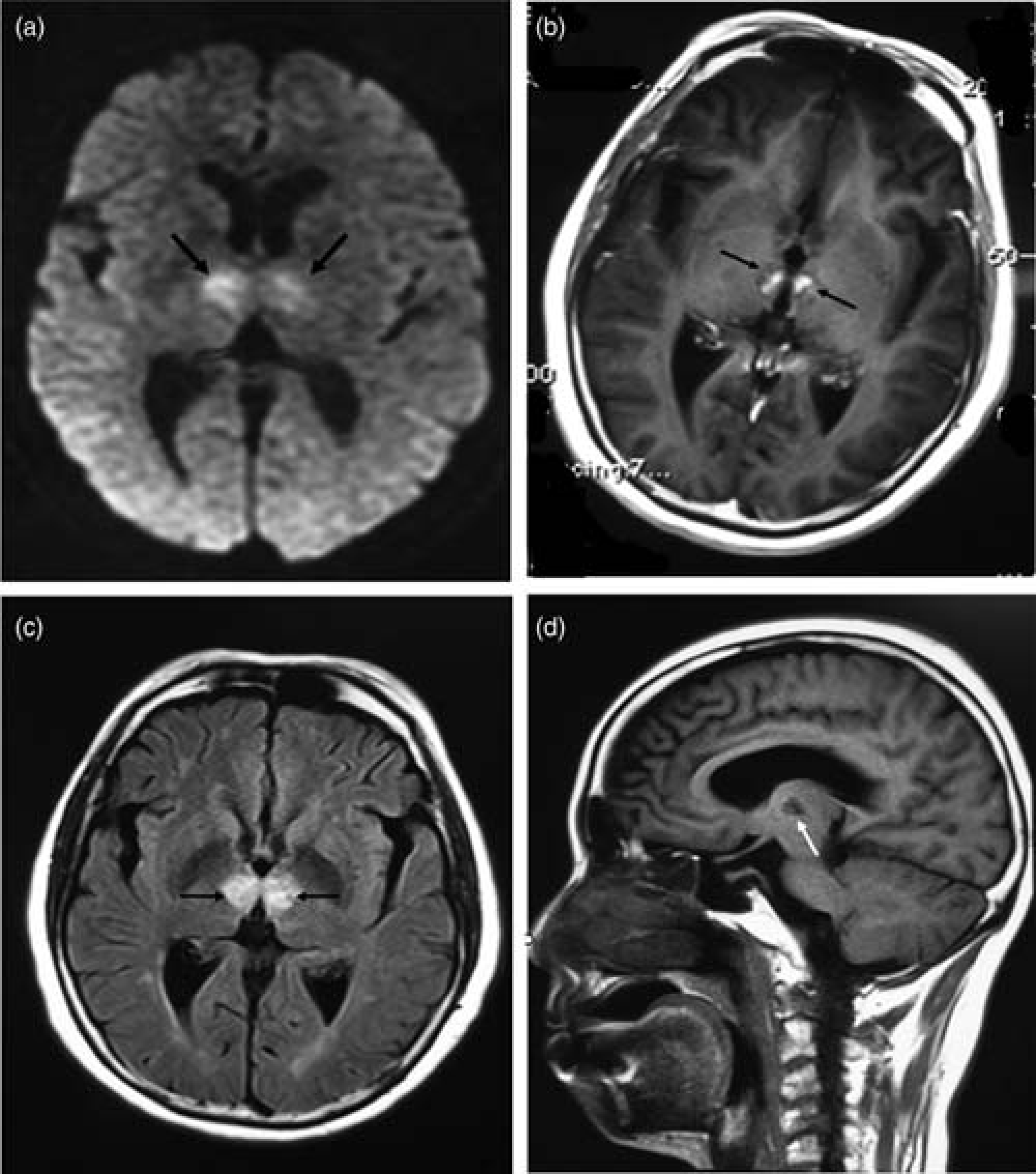(a) Axial trace diffusion-weighted image obtained 24 h after the onset of symptoms showed bilateral thalamic areas of high signal intensity (black arrows) suggesting acute paramedian thalamic infarcts. (b) Axial T1-weighted post-contrast image obtained after 20 days showed contrast enhancement in the bilateral thalamic infarcts (black arrows). (c) Axial flair-weighted image showed rounded areas (black arrows) of increased signal intensity in the medial thalamus. (d) Lateral T1 -weighted image showed bilateral paramedian thalamic without anterior thalamus and midbrain area of low signal intensity (white arrow)