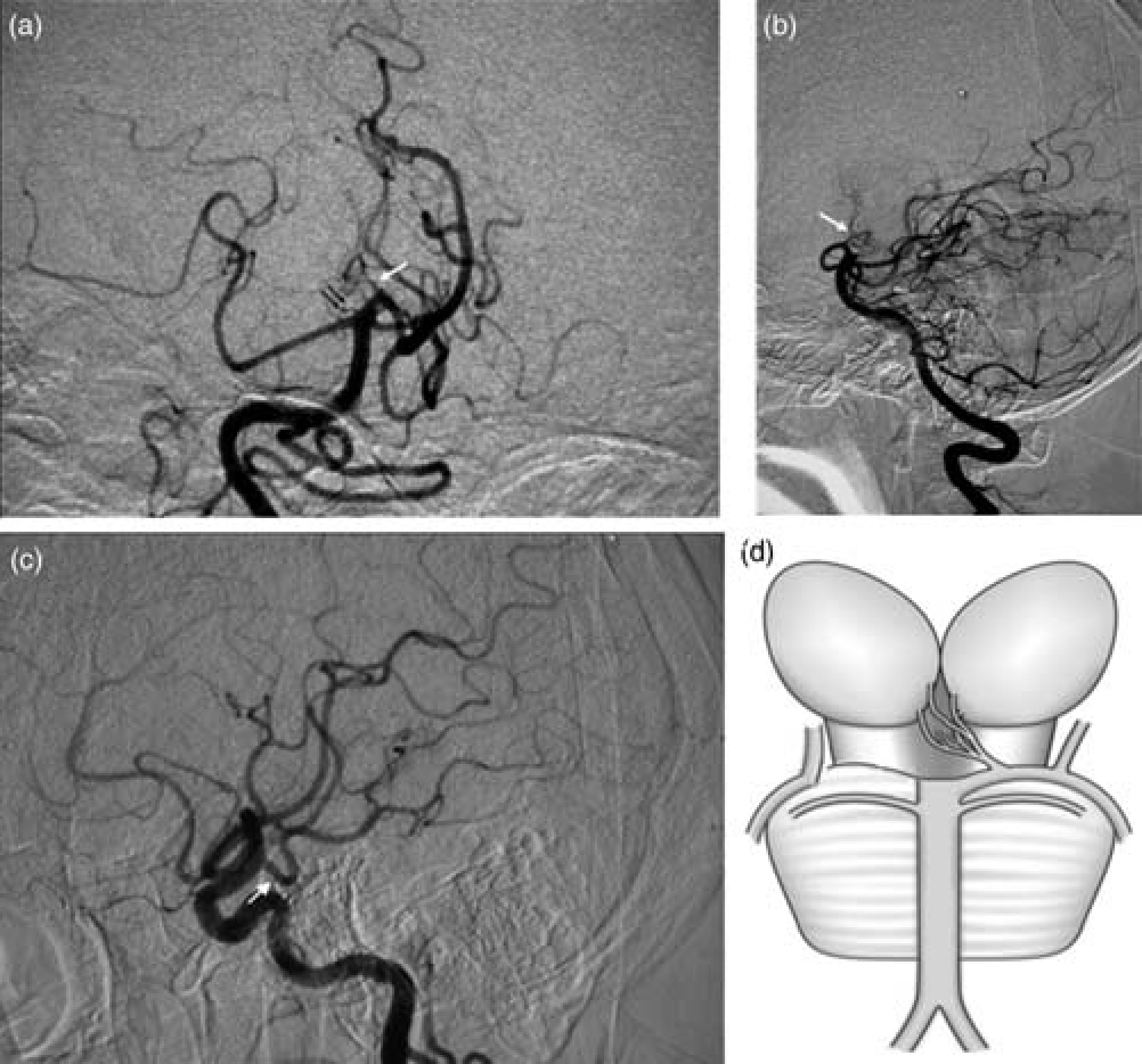 (a, b) DSA of the right vertebral injection, anteroposterior view (a) and lateral view (b) showed a stenotic AOP originating from the left P1 segment (white arrow). The P1 segment of the right PCA was absent (black double-arrow). (c) DSA of the right carotid artery injection showed the abnormally enlarged right PcomA could be the source of the right PCA (white arrow). (d) A schematic diagram represents a possible new variant of AOP. The P1 segment of the right PCA is absent while the AOP originates from the left