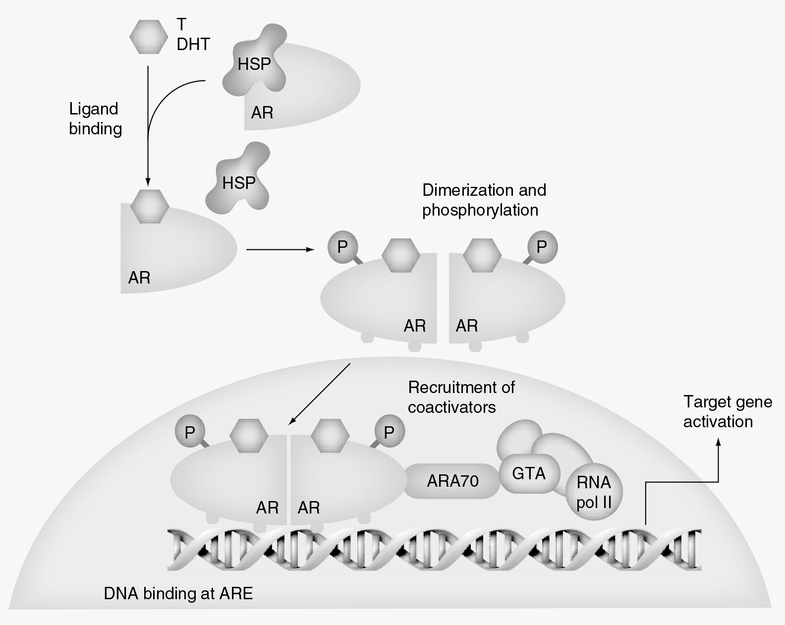When inactive, the AR is bound to heat shock proteins (e.g., heat shock proteins 90, 70, 56 and 23) that stabilize it in such a way to expose the C-terminal ligand-binding domain. Circulating androgens, such as testosterone and dihydrotestosterone, bind to this C-terminal ligand-binding domain, displacing the bound heat shock proteins through conformational change. Androgen-bound AR leads to AR dimerization and the requisite phosphorylation of its tyrosine kinase, which in turn causes translocation of the AR complex to the nucleus. The DNA-binding domain of the AR then binds to androgen response elements in both the promoter and enhancer regions of target genes and creates an active transcription complex upon recruitment of coregulatory proteins (Figure 1). Literature reveals that AR-regulated genes vary widely between cell lines and disease context, for example, in prostate cancer, which has become castrate resistant. Representative AR-regulated genes in castrate-resistant prostate cancer (CRPC) tissue code for enzymes in steroid precursor synthesis, PSA, TMPRSS2, IGF-1 and MYC [19]. In addition to regulating target gene transcription, the AR also interacts with signal transduction proteins in the cytoplasm, such as Src and Akt, which play key roles in cell survival, proliferation, invasion and angiogenesis [18].