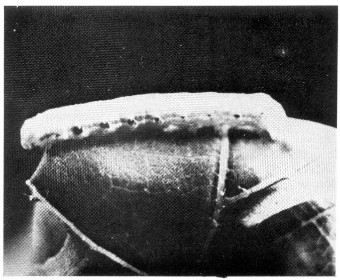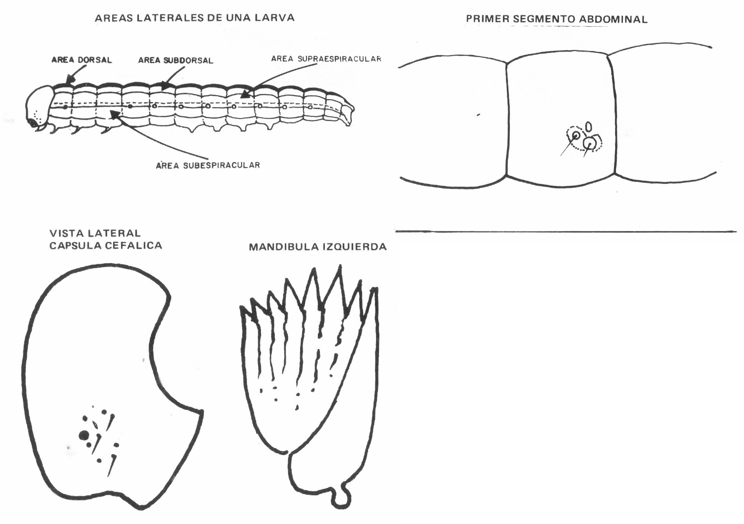 Por otra parte, las larvas poseen mandíbulas con ocho dientes, dispuestos a la manera de los dientes de una sierra (Figura 2). En la parte lateral de la cápsula cefálica, las larvas tienen seis ocelos, de los cuales el tercero es el más grande; el tercero y el cuarto están contiguos; el segundo es equidistante del primero y del tercero; el quinto y el sexto son equidistantes del cuarto ocelo (Figura 2).