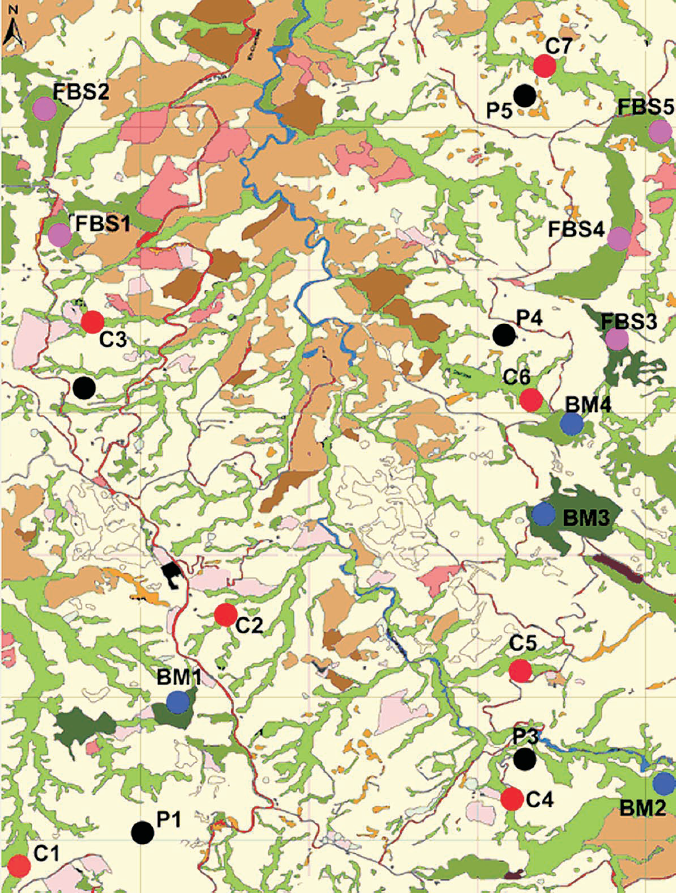 Interpretación de las coberturas vegetales del área de la cuenca media del río Chambery, Caldas-Colombia, mostrando 21 réplicas de cuatro elementos del paisaje. (BS: Bosque secundario, BM: Bosque maduro, C: Corredor ripário y P: Pastizal) (IAvHH 2005).