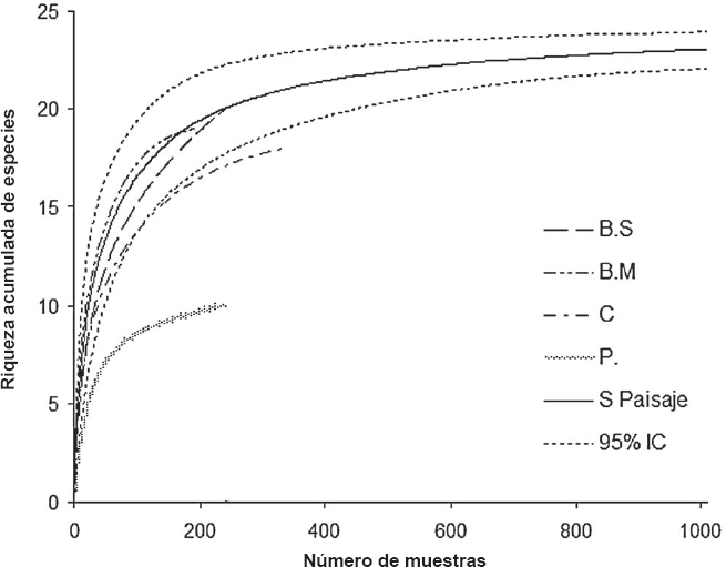 La curva de acumulación de la riqueza de todo el paisaje exhibe una tendencia asintótica y sugiere que el muestreo fue muy eficiente (97,8%). La mayor eficiencia de muestreo se obtuvo en bosque maduro (96%) y corredor ripario (94%); mientras que en bosque secundario y pastizal fue del orden del 80%. El análisis de rarefacción indicó que las diferencias en riqueza de especies se debieron a la diversidad contenida en cada elemento y no a la variación en el número de muestras (Fig. 2). Así, la riqueza fue mayor en bosque secundario (20 especies) seguida de bosque maduro (19), corredor ripario (18) y pastizal (10).