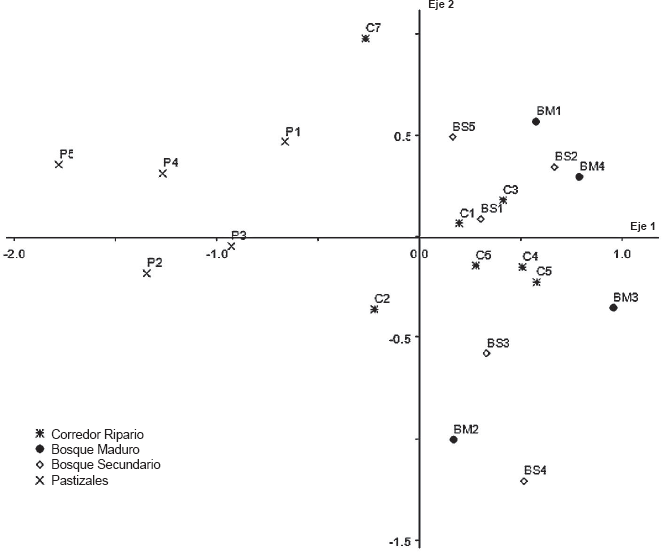 El análisis de escalamiento multidimensional no métrico (NMS) indicó que un ordenamiento en dos dimensiones es adecuado para representar los datos (Fig. 3). Los pastizales se separaron de los elementos con mayor cobertura vegetal, bosques y corredor ripario, y a su vez, éstos se agruparon a lo largo del eje 1 (Stress promedio = 42,306; Stress mínimo = 25,1; P < 0.05), sin encontrarse diferencias entre las réplicas (BM, BS, C), aunque éstas no se agruparon como elementos discretos.