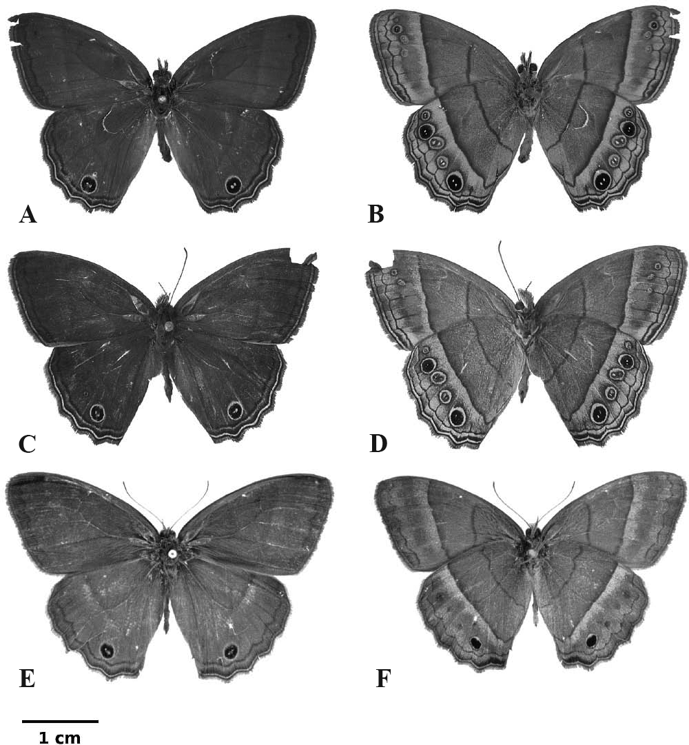 Pinned specimen of Cissia themis and Cissia similis, Copyright: Trustees of the NHM; used with permission. Cissia themis Syntype NHM (E) #982889: A. Dorsal surface. B. Ventral surface. Cissia themis (Arauca, Colombia). C. Dorsal surface. D. ventral surface. Cissia similis Syntype NHM (E) #982888. E. Dorsal surface. F. Ventral surface.
