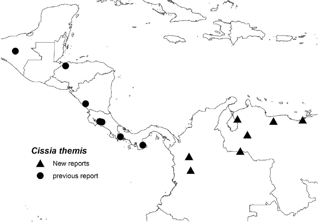 Some of the most poorly known groups among the neotropical butterflies are members of the subfamily Satyrinae in the family Nymphalidae. As a result of their evolutionary success, it is known to be the most diverse subfamily within the family (Ackery et al. 1998; Peña and Lamas 2005; Marín et al. 2011). Most of the members of the subtribe Euptychiina (euptychiine Satyrinae species) inhabit lowland forest of the neotropics. Elements of the group's taxonomy are often poorly known or understood and many undescribed taxa remain. Additional comprehensive work in laboratories as well as in the field are needed to clarify the taxonomy of this group (DeVries 1994; DeVries et al. 1997; Peña and Lamas 2005; Huertas et al. 2009; Marín et al. 2011). A true understanding of taxonomy and geographical distribution of these poorly known taxa will be extremely valuable towards improving our understanding of Neotropical biodiversity. In this paper, we focus on the genus Cissia, which includes 15 described species, two-thirds of whose members are residents of Central America (Montero-Ramírez and González-Maya 2009). Cissia themis (Butler, 1867) is one of these Central American species and to date no record from the South American continent (delimited by the Darién watershed along the border of Colombia and Panama) is known for this species except for the island of Trinidad (Barcant 1970; Singer and Ehrlich 1991). Here, we report four newly discovered localities of occurrence for C. themis in Venezuela. The first author also detected a couple of Colombian specimens misidentified as "Cissia similis" in the MEFLG which are actually C. themis. All of these records are new country records.