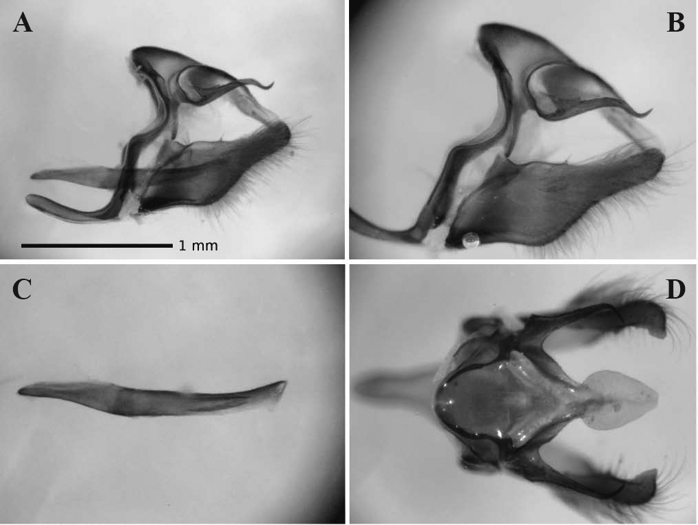 Male genitalia of Cissia themis (Colombia) A.-B. Lateral view. C. Aedeagus. D. Dorsal view.