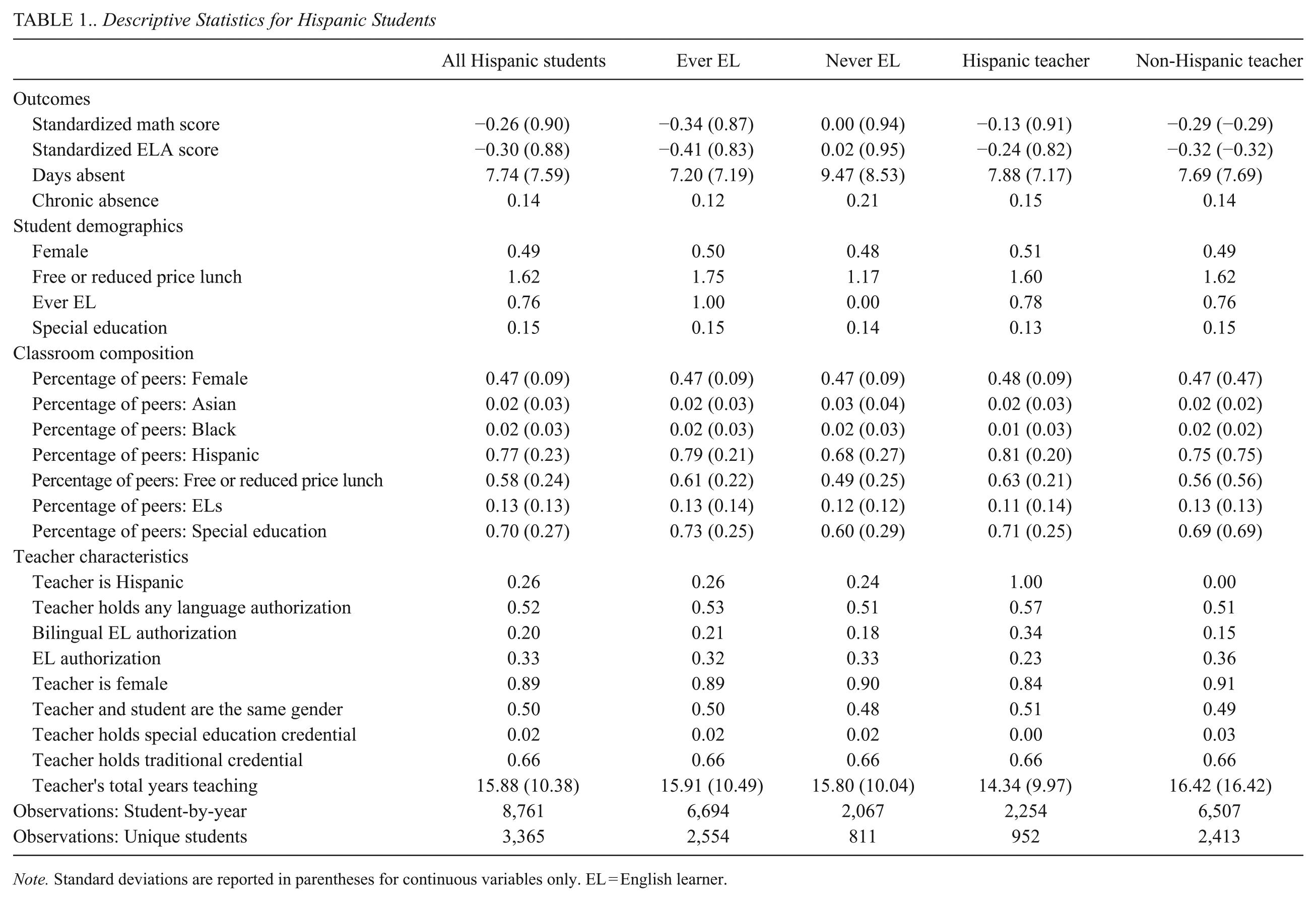For students, the dataset includes a time-varying indicator for EL status, with nearly 97% of students in this district being Spanish-speaking ELs. Using this information, we created an “ever EL” measure, which identifies students who were classified as an EL at any point during the period of data collection (76% of our sample). We use “Ever EL” status rather than current EL status for several reasons. First, students can enter and exit EL status over time, but they may continue to benefit from having a teacher who shares their primary language even after reclassification. For instance, the ability of Spanish-speaking teachers to communicate with parents in their preferred language remains valuable, regardless of the student’s reclassification status. Moreover, using Ever EL status ensures that the variation in our matching variables comes from differences in teacher characteristics rather than from changes in student classifications. For the remainder of this article, we refer to these students as ELs and non-ELs, based on their Ever EL status.