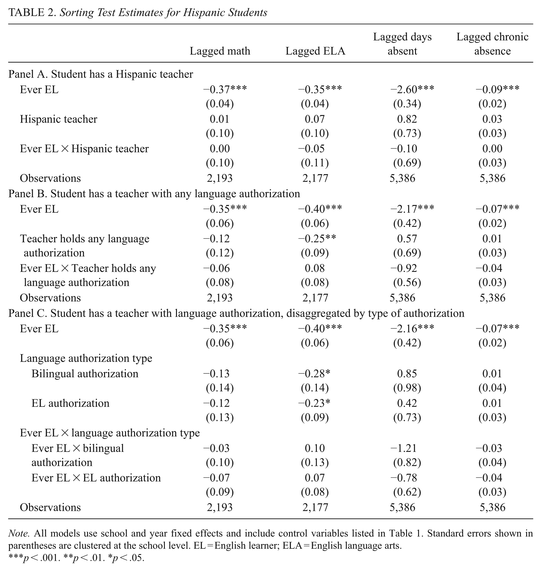 A key concern in studies of student–teacher matching is the possibility of sorting, where the probability of a match between a Hispanic student and a Hispanic or language-authorized teacher could be influenced by preexisting student or teacher characteristics. Such sorting could confound the observed relationship between these matches and student outcomes, leading to biased estimates. To address this concern, we conducted a sorting test by regressing various lagged student outcomes on our matching variables to determine if preexisting differences are driving the observed associations.