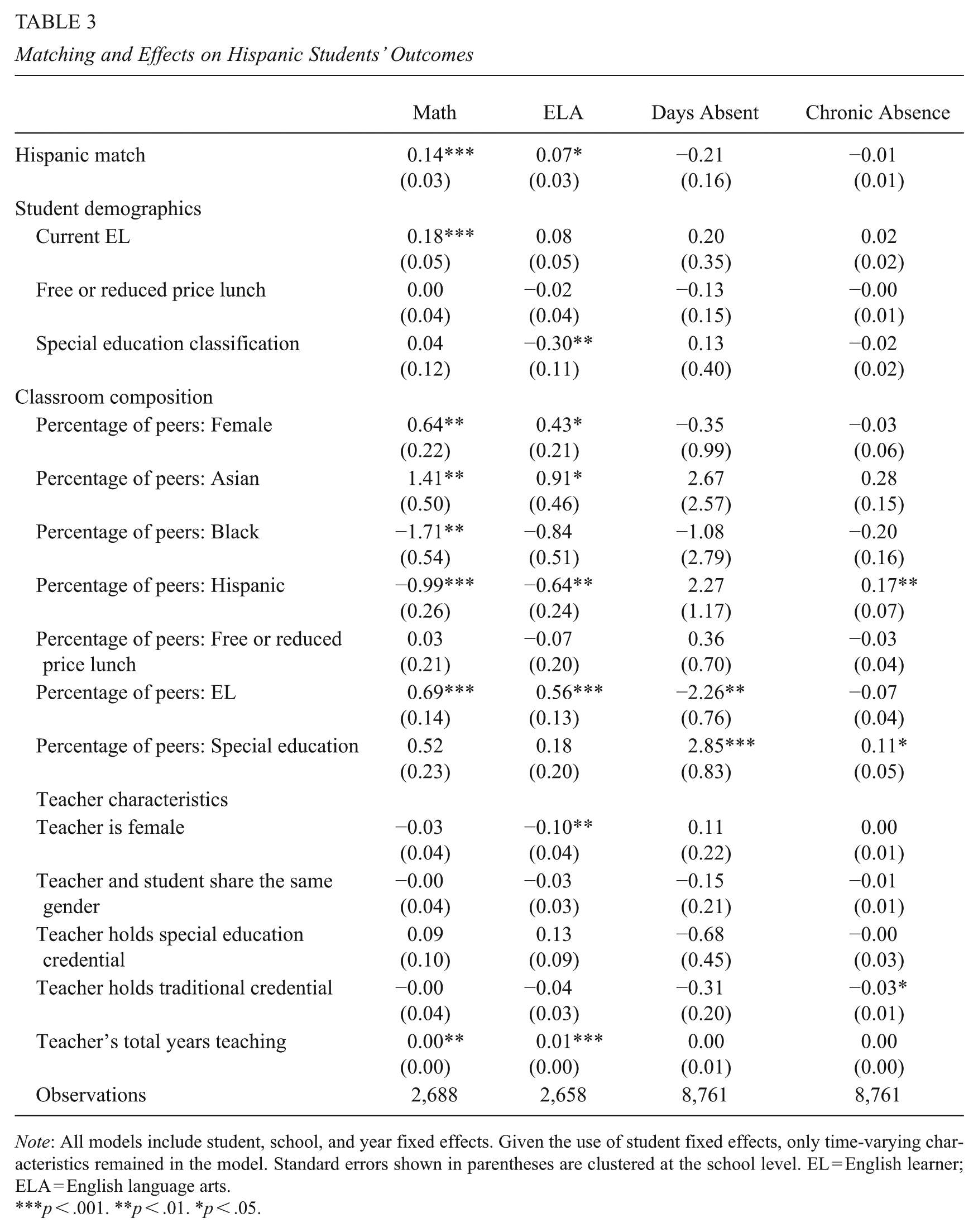 Our results show a positive and statistically significant association between Hispanic student–teacher matching and student achievement in both math and ELA. The effect on math achievement is notably larger (0.14