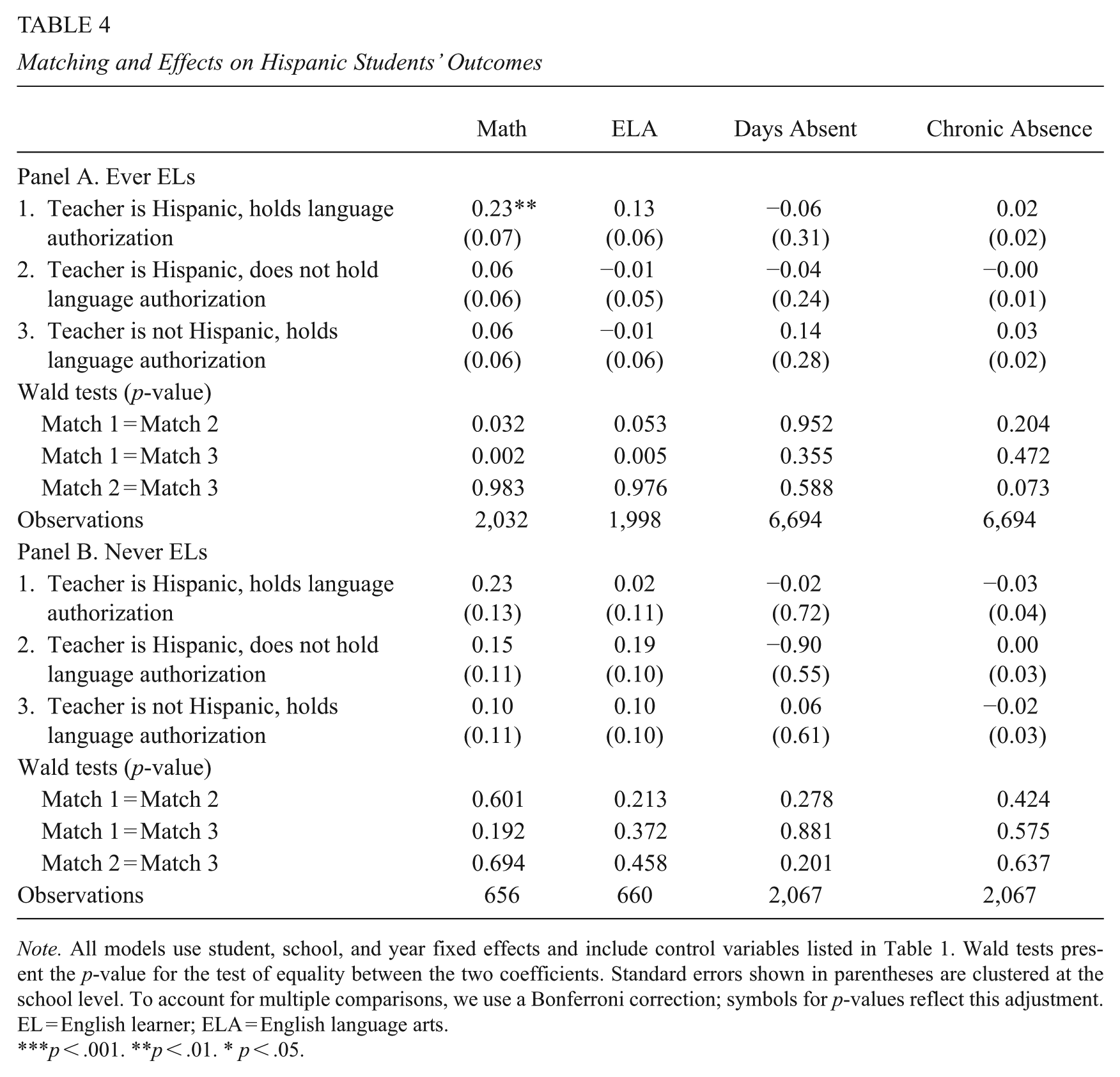 In sum, these test score findings reveal that parsing apart teachers’ language authorization and teacher ethnicity is essential for understanding the teacher/student matching phenomenon for Hispanic students. Namely, as a baseline, the math and ELA models in Table 3 indicate that Hispanic students score higher when matched with a Hispanic teacher. Yet, when teacher language authorization is taken into consideration in Table 4, it becomes clear that Hispanic EL students matched with Hispanic teachers with a language authorization score even higher in math (0.23