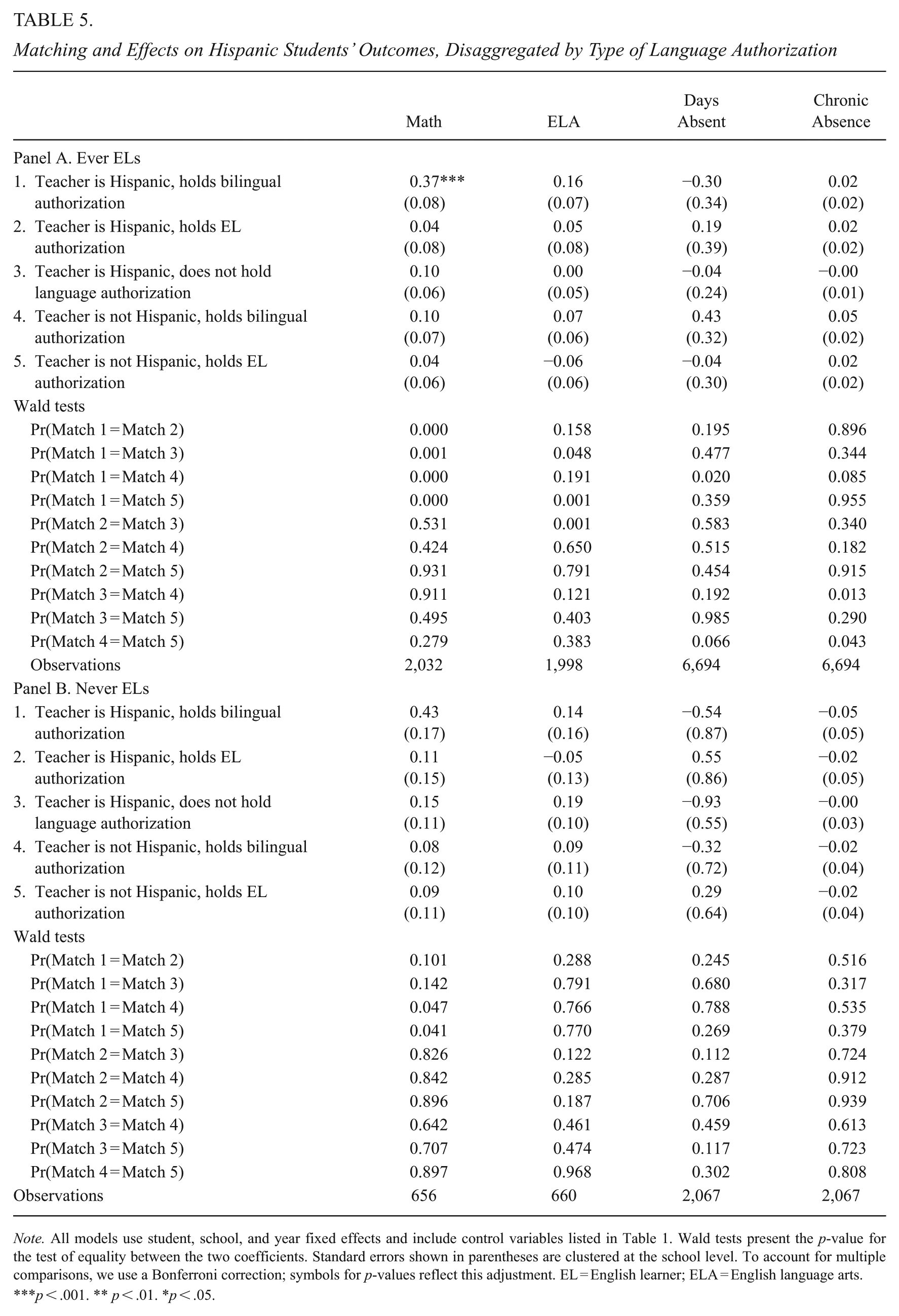 When Hispanic EL students are assigned to Hispanic teachers with a bilingual authorization, they have significantly higher math scores. Student EL status does appear to moderate this relationship as the relationship is not present for Never EL students. Specifically, in Table 5 Panel A, we explore findings for Hispanic students who were ever classified as ELs, reporting an effect size of 0.37