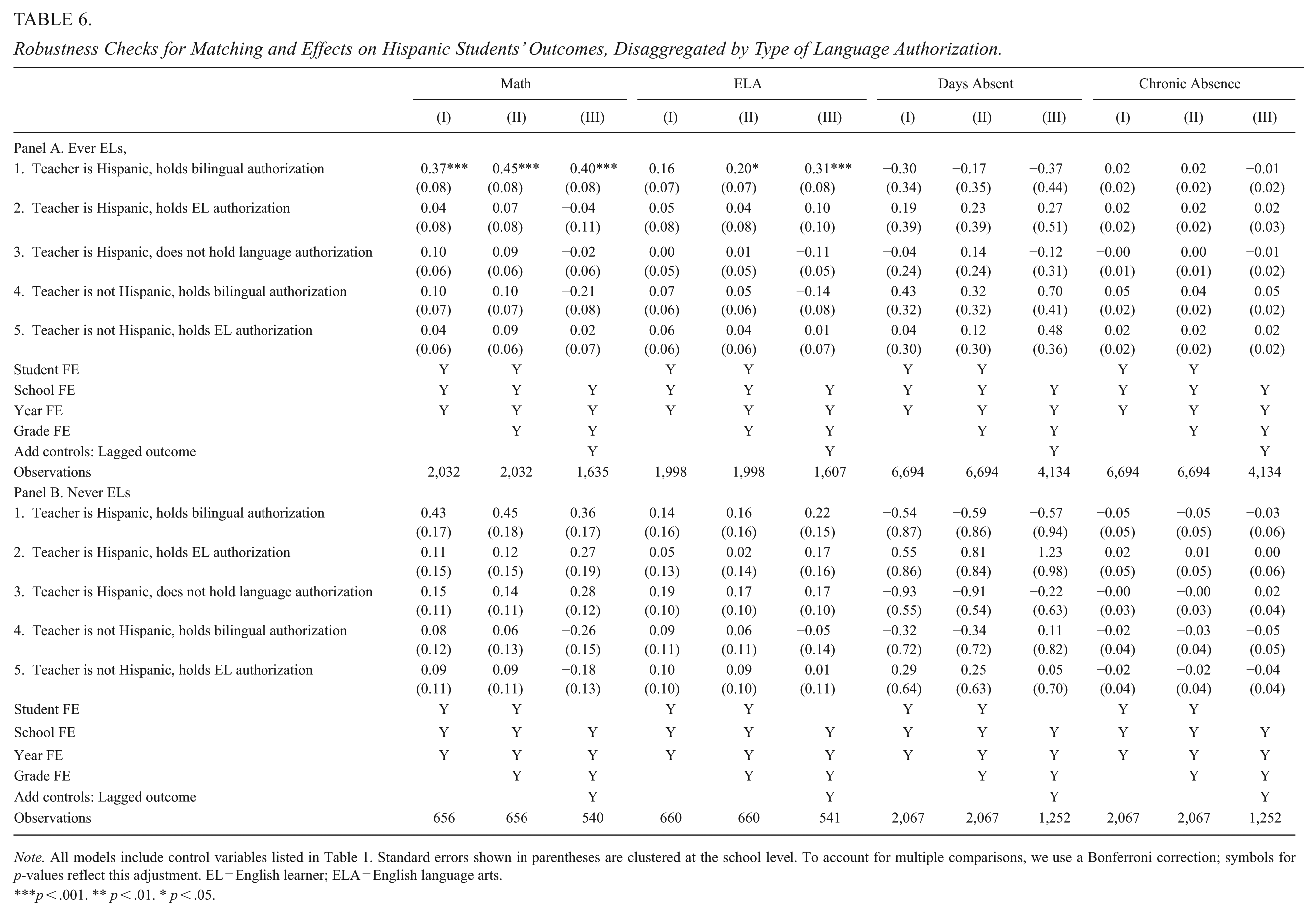 In Table 5 Panel A, we report findings for Hispanic ELs. There is no evidence of a change in the ELA scores of students in this group assigned to a teacher who is Hispanic but who holds either a bilingual authorization or an EL authorization. In Panel B, we report findings for Hispanic non-ELs. Likewise, we observe no change in ELA scores for students in this group assigned to a teacher who is Hispanic but who holds either a bilingual authorization or an EL authorization. This finding is perhaps expected, given that these students were never classified as ELs and therefore would be less likely to derive additional benefit from either type of teacher language authorization.