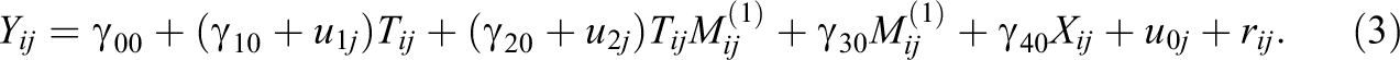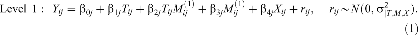 Random slope models allow us to test whether the treatment effect varies across moderator subgroups and whether the moderated treatment effects vary randomly across schools. To test for the Level 1 moderation, we use two-level random slope hierarchical linear modeling (HLM; Raudenbush & Bryk, 2002):
