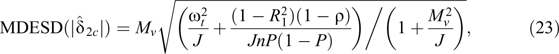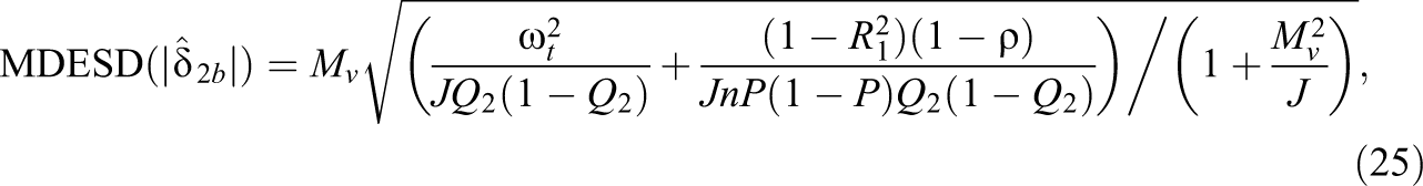 In addition to knowing the statistical power for a study to detect a desired effect size, it is useful to know the MDESD that a moderation study can detect with sufficient power (e.g., 80%) given sample sizes. The MDESD can be expressed as (Bloom, 1995, 2005, 2006; Dong et al., 2018; Murray, 1998)