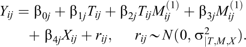 The hierarchical linear models with a nonrandomly varying slope assume that the treatment effect varies by the moderators but does not randomly vary across sites (Models MRT2-1N-1 and MRT2-1N-2 in Table 1 and below).