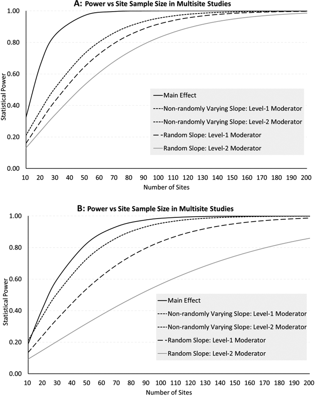 Furthermore, we demonstrate the relationship between power and total sample size of sites by comparing the main treatment effect design with four moderation designs with binary moderators in Figure 1A and 1B. The power was calculated independently for main effects and moderated effects based on the same assumptions as in Table 7: