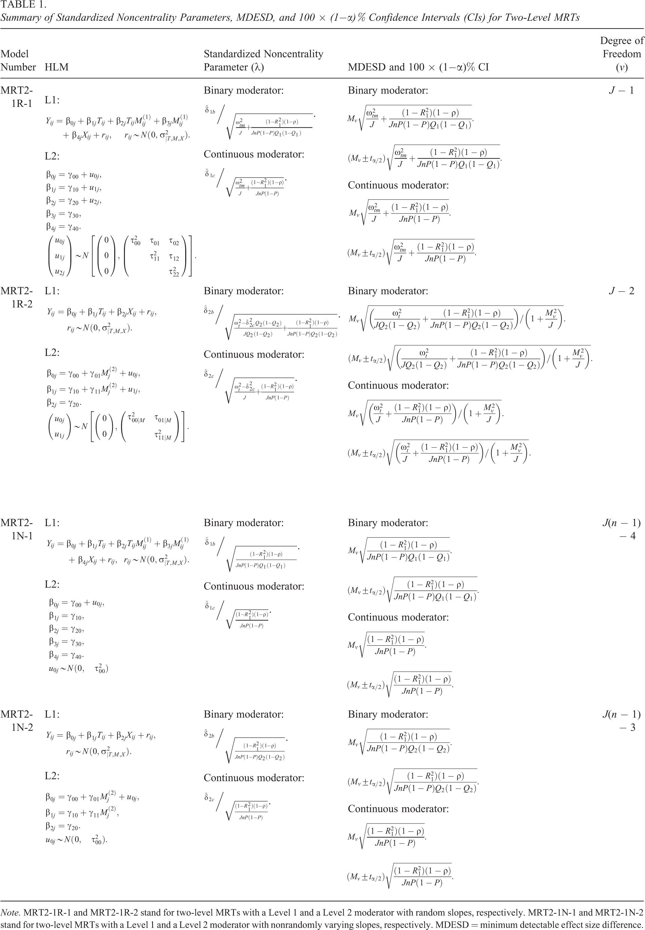 The purpose of this study is to develop a more comprehensive statistical framework and set of tools for the effective and efficient design of MRTs probing moderated treatment effects. As noted above, the framework we develop considers the intersections of three facets of multilevel moderation that are common in practice: (a) Level 1 and Level 2 moderator variables, (b) random and nonrandomly varying slopes (coefficients) of the treatment variable and the interaction term between the treatment and moderator variables, and (c) binary and continuous moderators. Our investigation of these facets developed formulas that delineate statistical power, the MDESD, and their corresponding confidence intervals (CIs). We also created software to assist researchers conducting power analyses for various moderated treatment effects. 1