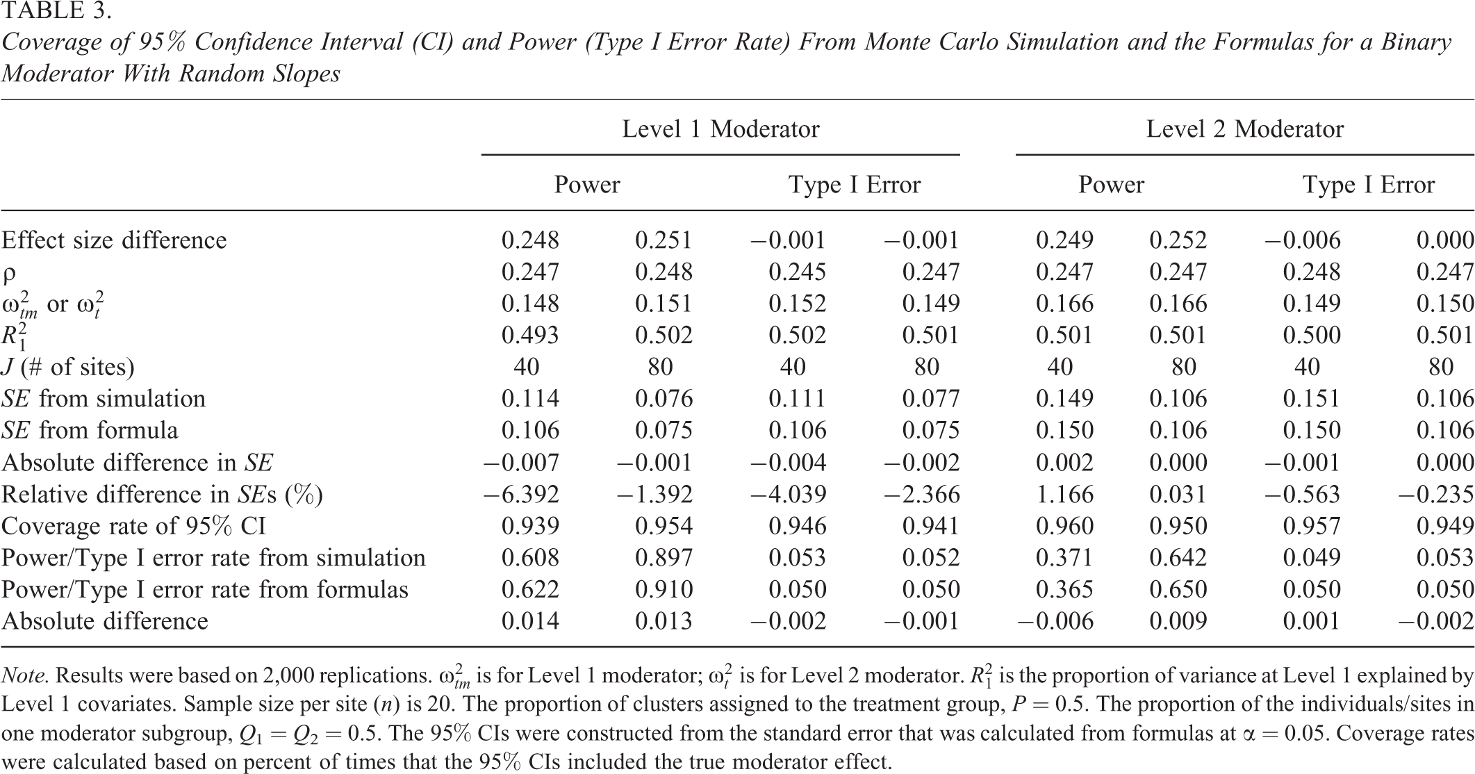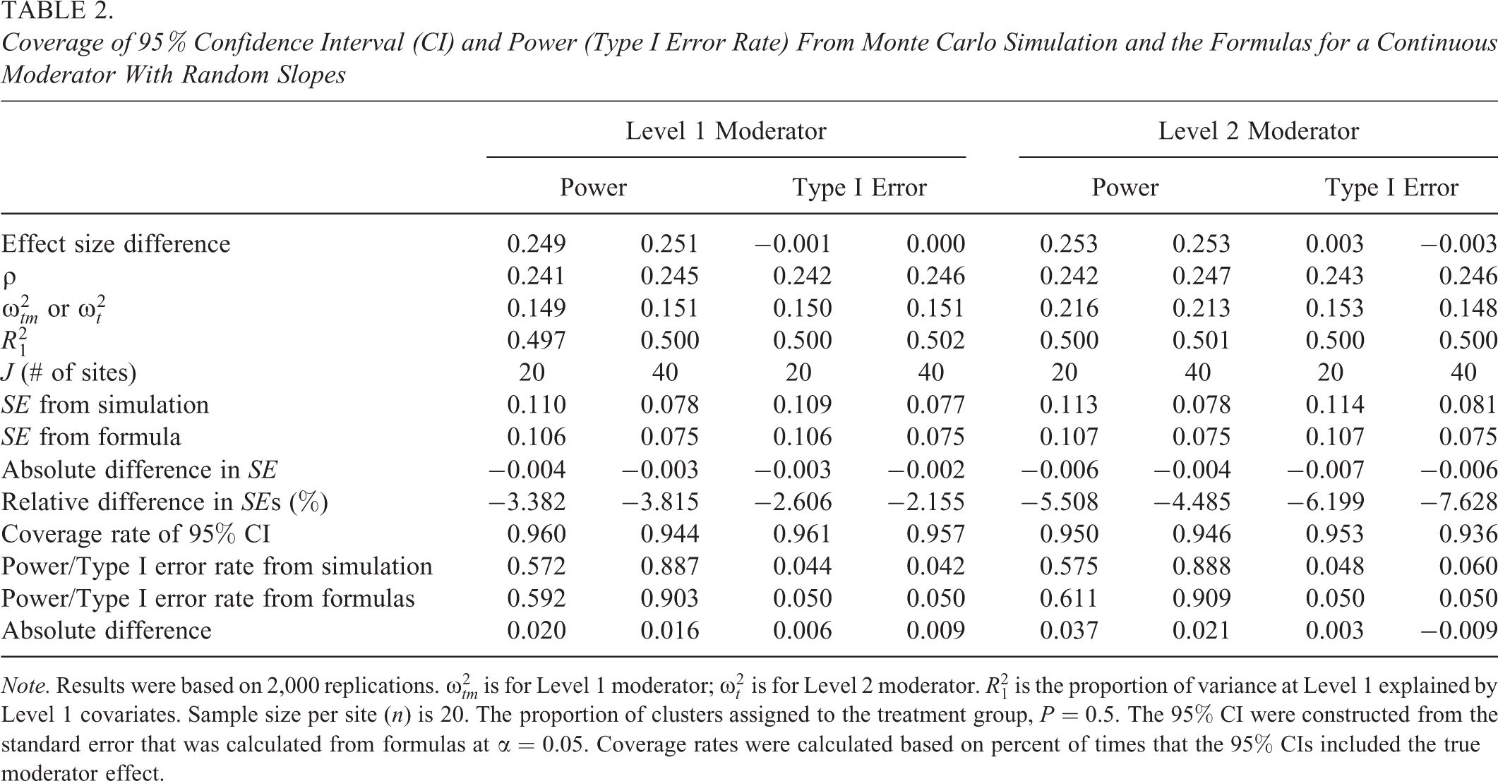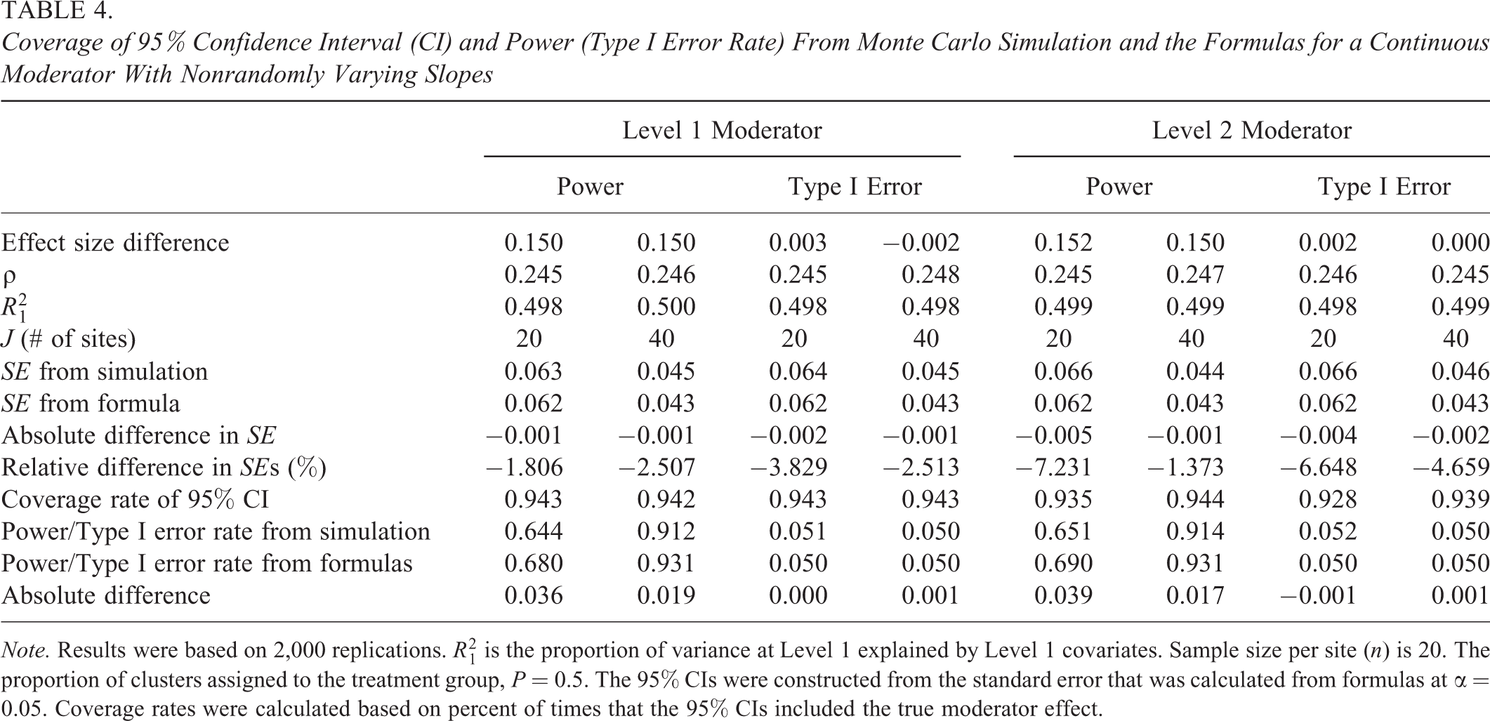 Coverage of 95% Confidence Interval (CI) and Power (Type I Error Rate) From Monte Carlo Simulation and the Formulas for a Continuous Moderator With Nonrandomly Varying Slopes