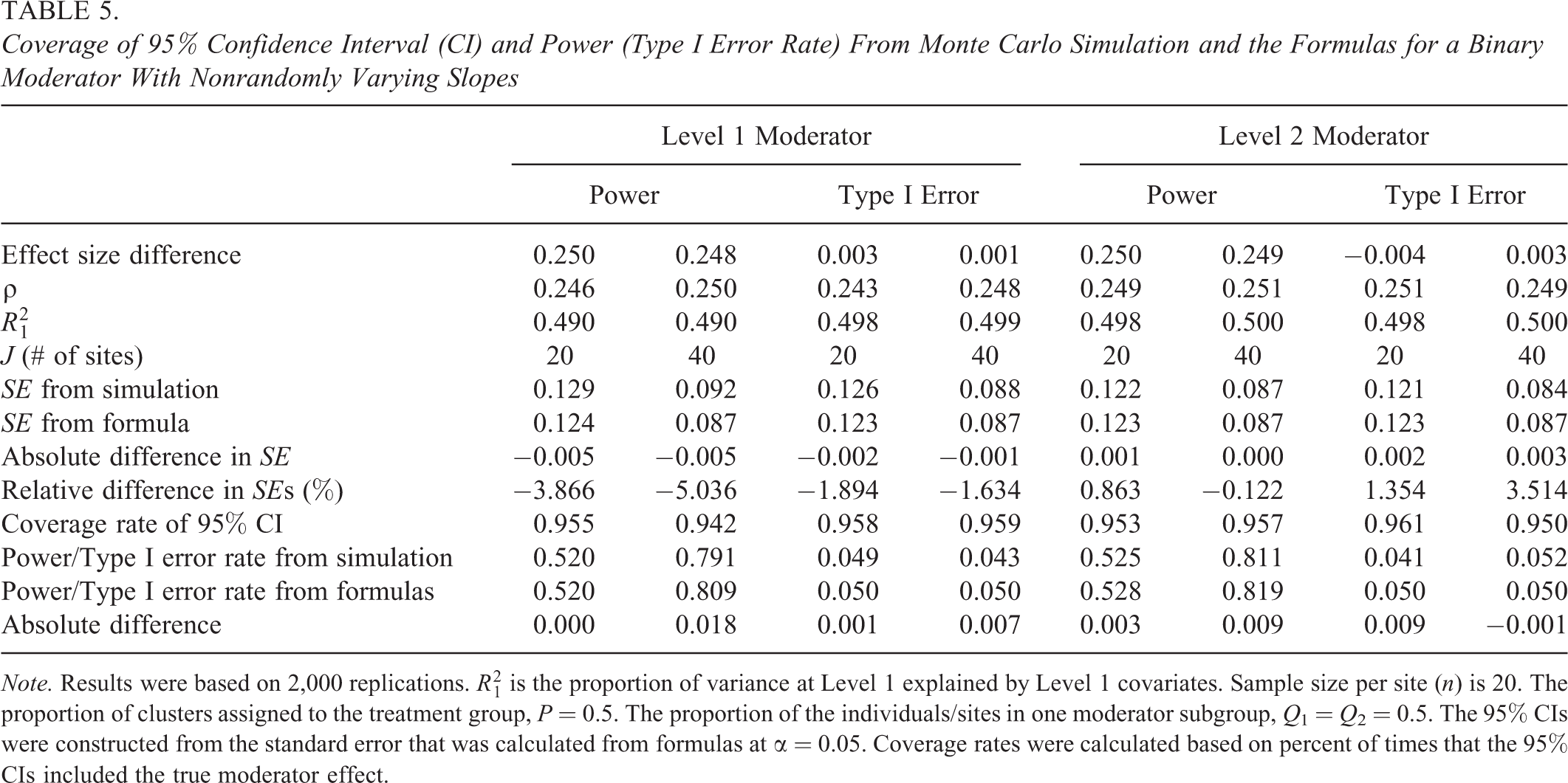 Coverage of 95% Confidence Interval (CI) and Power (Type I Error Rate) From Monte Carlo Simulation and the Formulas for a Binary Moderator With Nonrandomly Varying Slopes