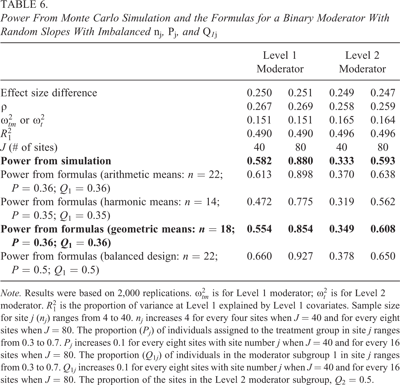 Power From Monte Carlo Simulation and the Formulas for a Binary Moderator With Random Slopes With Imbalanced