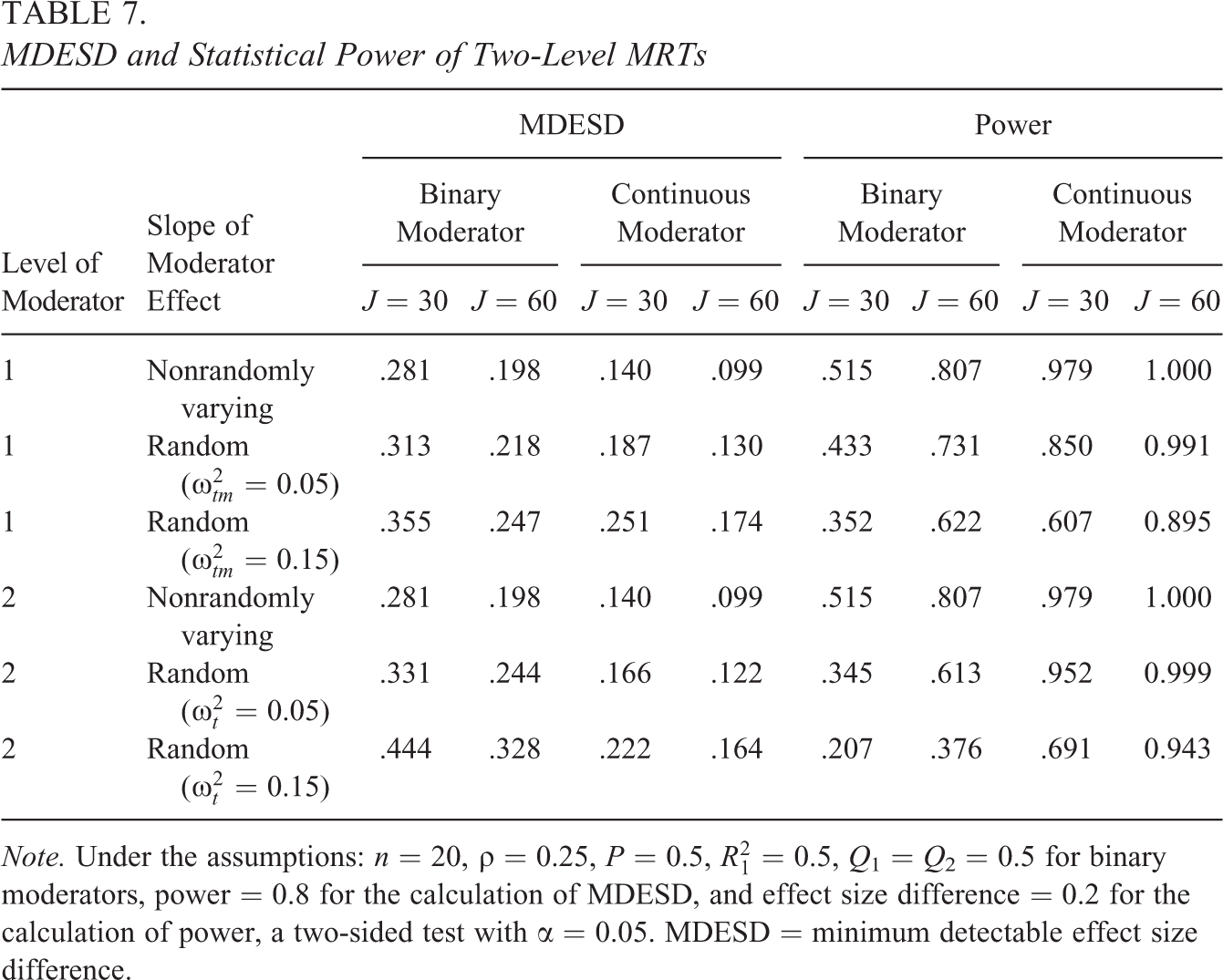 In planning an MRT, a key design consideration is the sample size necessary to achieve adequate statistical power (probability of detecting the main treatment effect and moderated treatment effect). A strong literature base exists for conducting power analyses for the main effects of MRTs already exist (e.g., Borenstein & Hedges, 2012; Dong & Maynard, 2013; Konstantopoulos, 2008; Raudenbush et al., 2011) and for conducting power analyses for main effects and moderator effects in CRTs (e.g., Dong et al., 2018; Spybrook, Kelcey, & Dong, 2016). However, there is less work on power calculations for moderated treatment effects in MRTs. Raudenbush and Liu (2000) developed power formulas for the site-level (Level 2) binary moderator effect in MRTs, and Bloom and Spybrook (2017) developed formulas for the minimum detectable effect size difference (MDESD) for the site-level binary moderator in MRTs. However, the scope of such studies has largely been limited to binary site-level moderators in MRTs. Missing from this literature is a more comprehensive statistical framework for power analyses of moderated treatment effects in MRTs that incorporates the considerations noted above (e.g., continuous moderators, random slopes) and a careful analysis delineating the parameters that govern power and their proportional influence (e.g., how does the intraclass correlation [ICC] coefficient or treatment effect variation/heterogeneity of coefficients affect power).