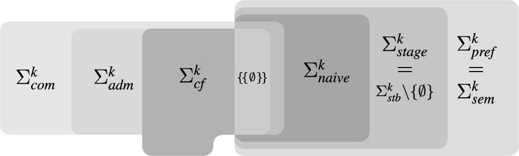 The concept of signatures of argumentation semantics was introduced in [7] to characterize the expressiveness of Dung AFs and has been extended to other argumentation frameworks [19,20]. Signatures characterize all possible sets of extensions, argumentation frameworks can provide for a given semantics.