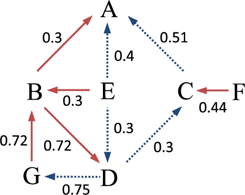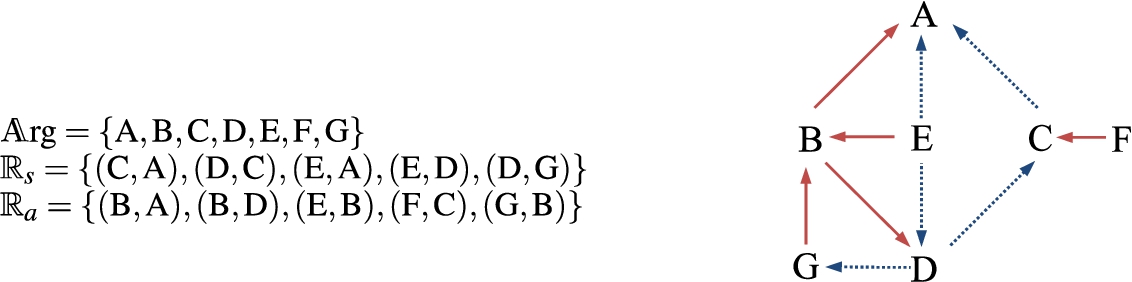 Figure 1 represents the attack and support relation between arguments, using solid arrows and dashed arrows, respectively. Observe that there is a supported attack from