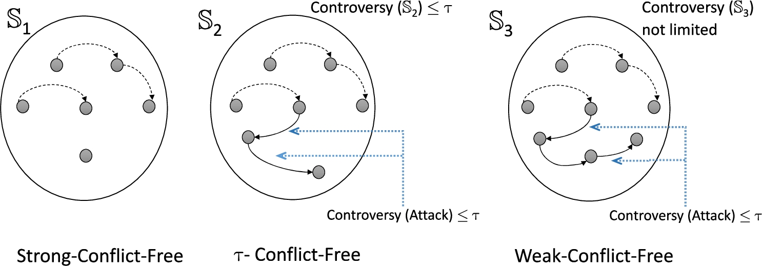Note that, conflict-freeness and safety sets are expanded from a classical one to be more “flexible” sets. In this sense, we can introduce weak attackers into the argument sets; consequently, these new arguments can be strong attackers of the previous ones (see Fig. 8). Thus, there is no strict inclusion relationship between the different types of conflict-free sets. The intuition is that, if we raise the tolerance to attack up to a threshold