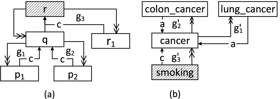 In this paper, we also consider generalisations that are neither causal nor evidential. For instance, abstractions [4,12] allow for reasoning at different levels of abstraction. More precisely, abstractions are of the form ‘can usually/normally/typically/always be considered a specialisation of q’ (e.g. guns can usually be considered deadly weapons), where antecedents are considered to be more specific than the more abstract consequent q. As noted by Console and Dupré [12], abstractions are syntactically the same as causal generalisations but they are semantically different in that the antecedents of abstractions do not express causes for the consequent or vice versa. Abstractions may be defeasible (cf. [4]) but may also be strict (cf. [12]); an example of a strict abstraction is generalisation lung_cancercancer, which states that lung cancer is a type of cancer. An example of defeasible abstraction is gundeadly_weapon, where an example of an exception to this generalisation is that the gun is a non-functional replica, or a water gun.