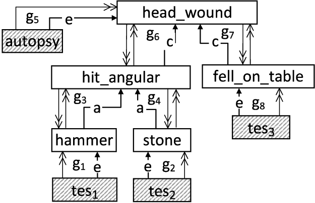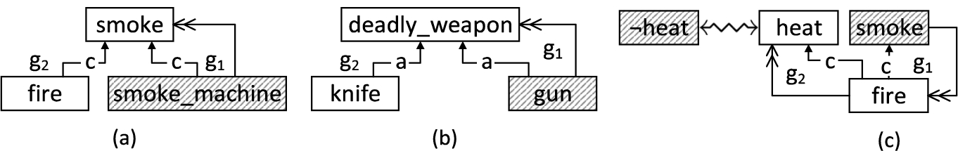 By affirming the common consequent (deadly_weapon), gun and knife are abductively inferred using generalisations and , which are then competing alternative explanations of deadly_weapon.
