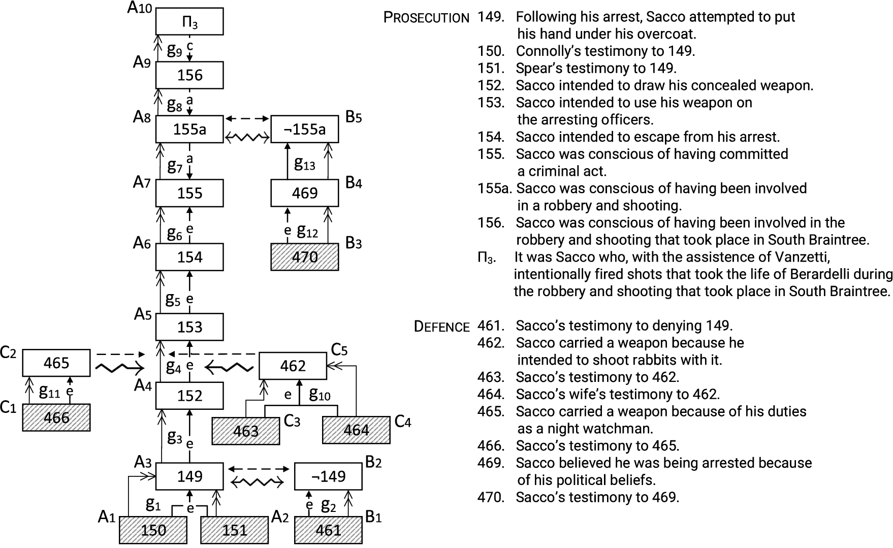 Inference is the process of drawing conclusions from premises starting from the evidence, where evidence is that what has been established with certainty in the context under consideration. For instance, in the context of a legal trial, the evidence consists of that what is actually observed by a judge or jury, such as documents (e.g. police and autopsy reports) and other tangible evidence, as well as testimonial evidence [2]. Inference is often performed using domain-specific generalisations [2,4,6], also called defaults [25,32], which capture knowledge about the world in conditional form. Generalisations can either be strict or defeasible, where defeasible generalisations are of the form ‘If, then usually/normally/typically b’ and strict generalisations are of the form ‘If, then always b’. Here, claims are called the antecedents of the generalisation and b its consequent, where we assume that claims are literal propositions and that generalisations have one or more antecedents and exactly one consequent. In case a generalisation has multiple antecedents, it expresses that only the antecedents together allow us to infer the consequent. We semi-formally denote generalisations as , among others to ease the description of examples in this section and in Section 3. For defeasible generalisations, exceptional circumstances can be provided under which the generalisation may not hold, whereas strict generalisations hold without exception. An example of a (defeasible) generalisation is ‘If fire, then typically smoke’, where ‘fire’ is its antecedent and ‘smoke’ its consequent. An example of an exception to this generalisation is that sufficient oxygen is present for complete combustion to occur.